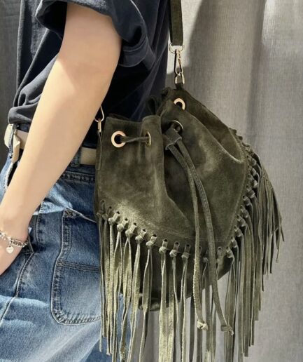 Bolso saco caqui con flecos boho soul