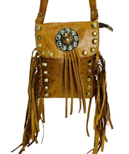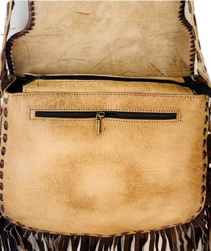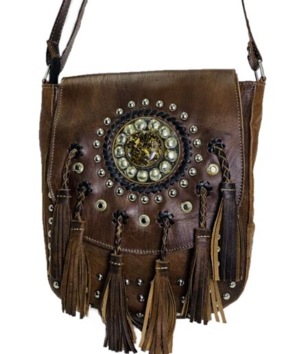 bolso de cuero con flecos borlas étnico marrón Kurt