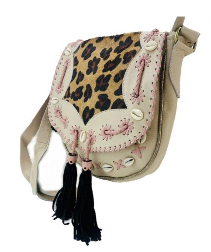 Bolso de cuero con flecos borlas tribal étnico beige Ken