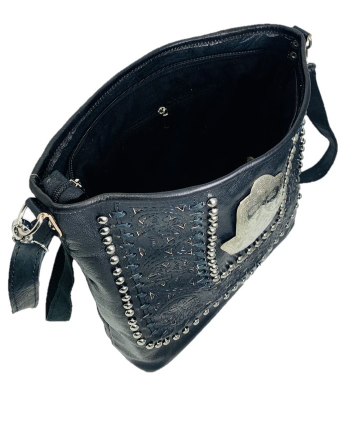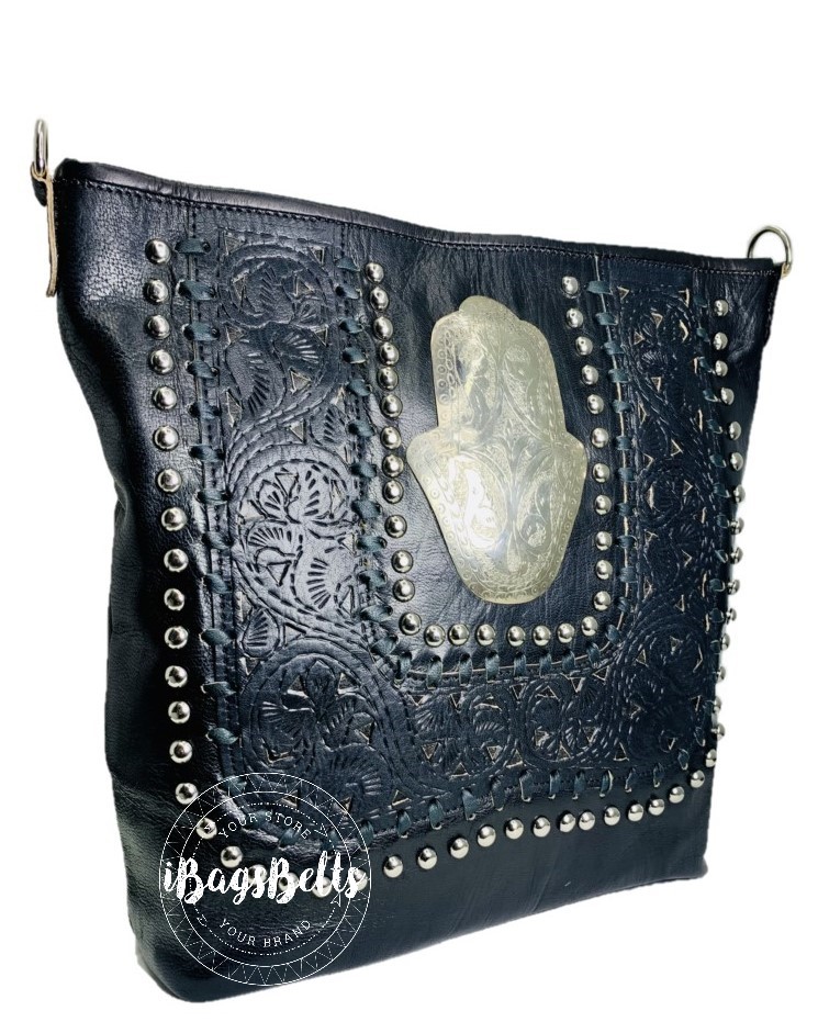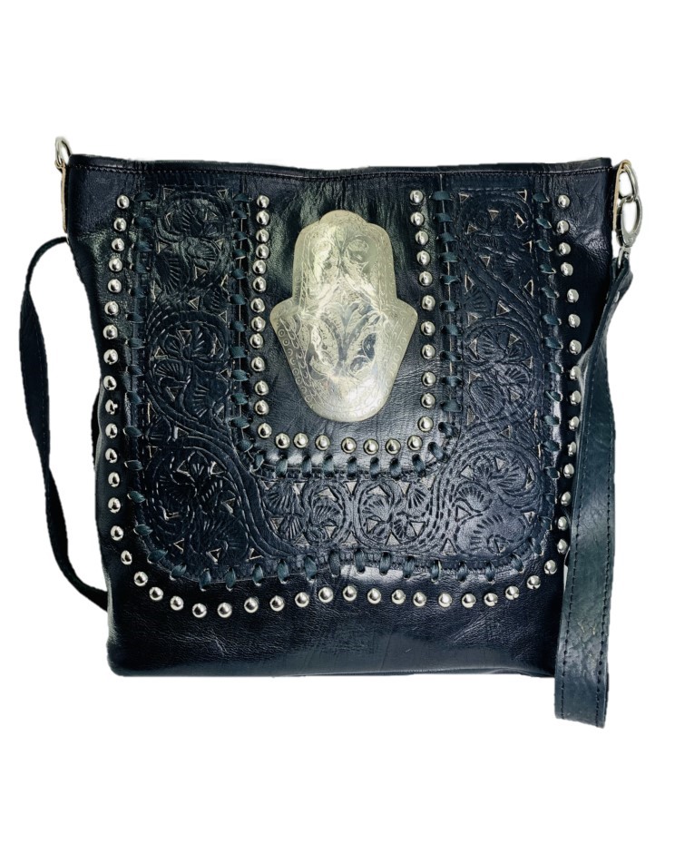 Bandolera muy elegantes reflejadas en la decoración artesanal, retro y fresco Escudo de mano de Fátima rodeado de muchos remaches. Perfecto para una noche de fiesta, bodas, cenas, fiestas, clubes, citas, ir de compras con amigos, por supuesto, también para el uso diario, le traerá muchos elogios.