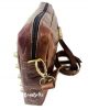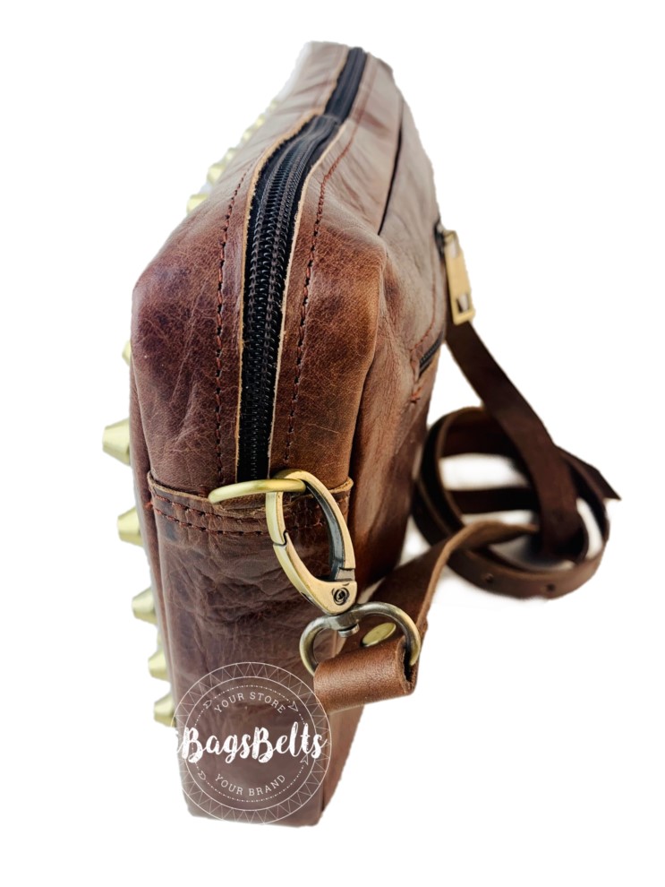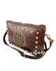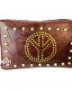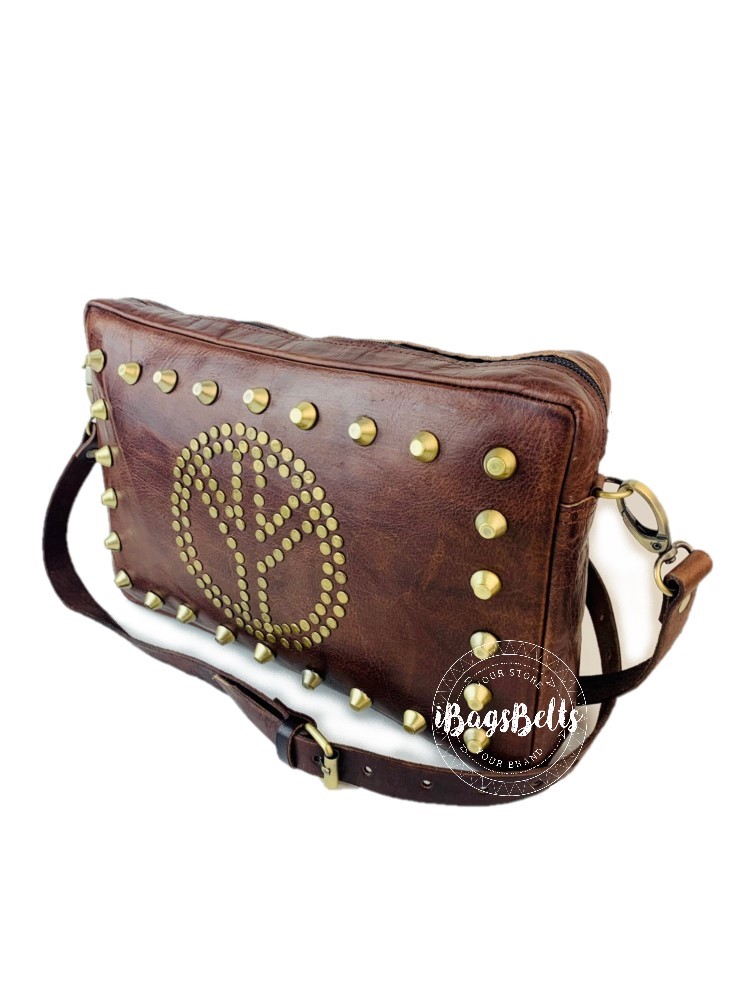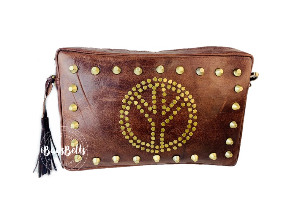 Bandolera mediana en cuero artesanal con apliques metálicos en la parte frontal en forma del símbolo de la paz y cierre de cremallera.