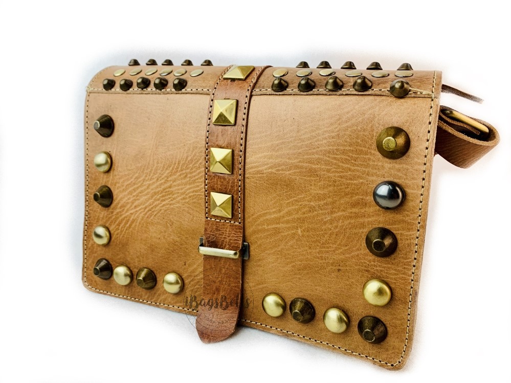 Bandolera pequeña en cuero artesanal con apliques metálicos en la solapa y cierre de imán.