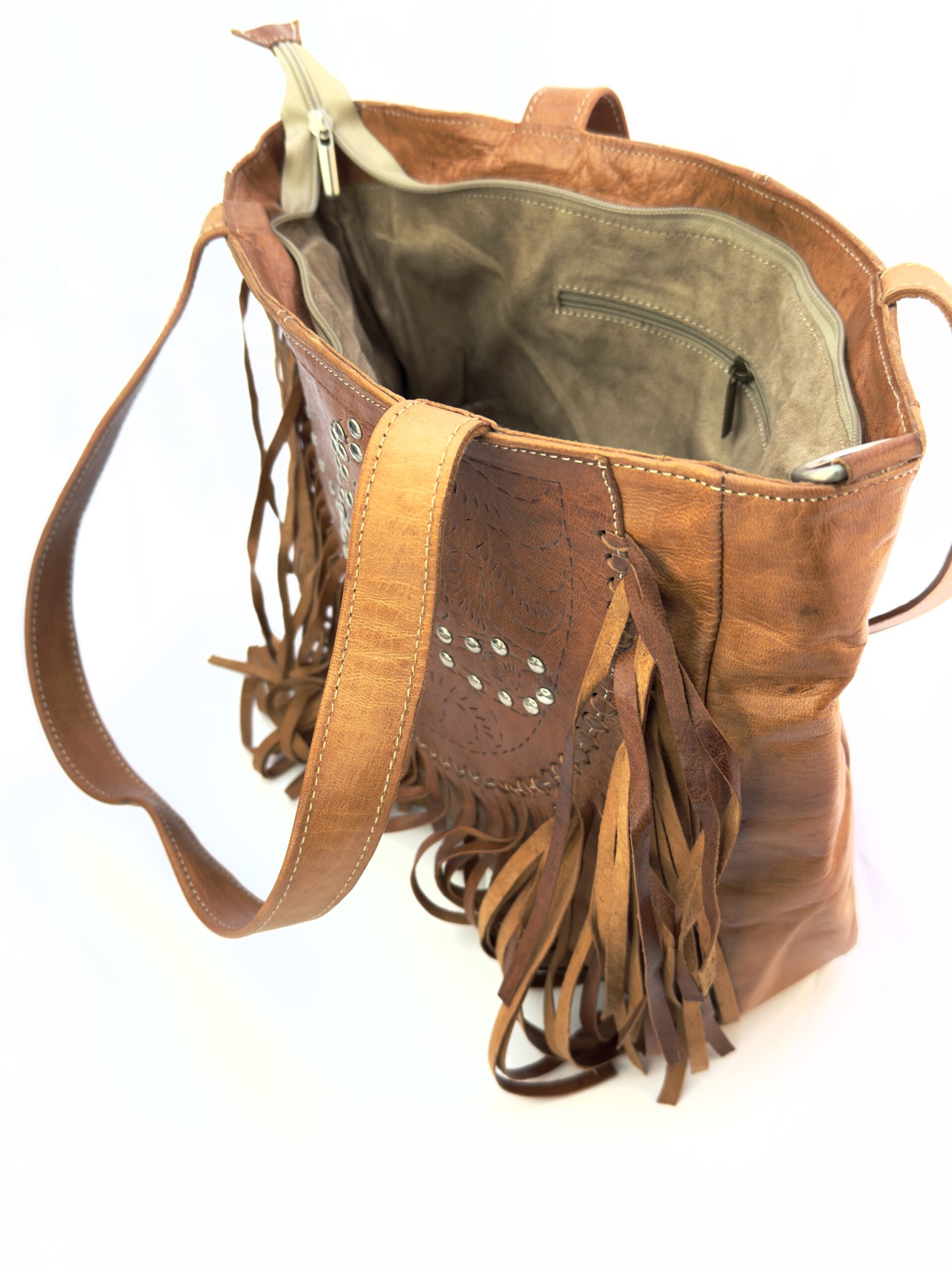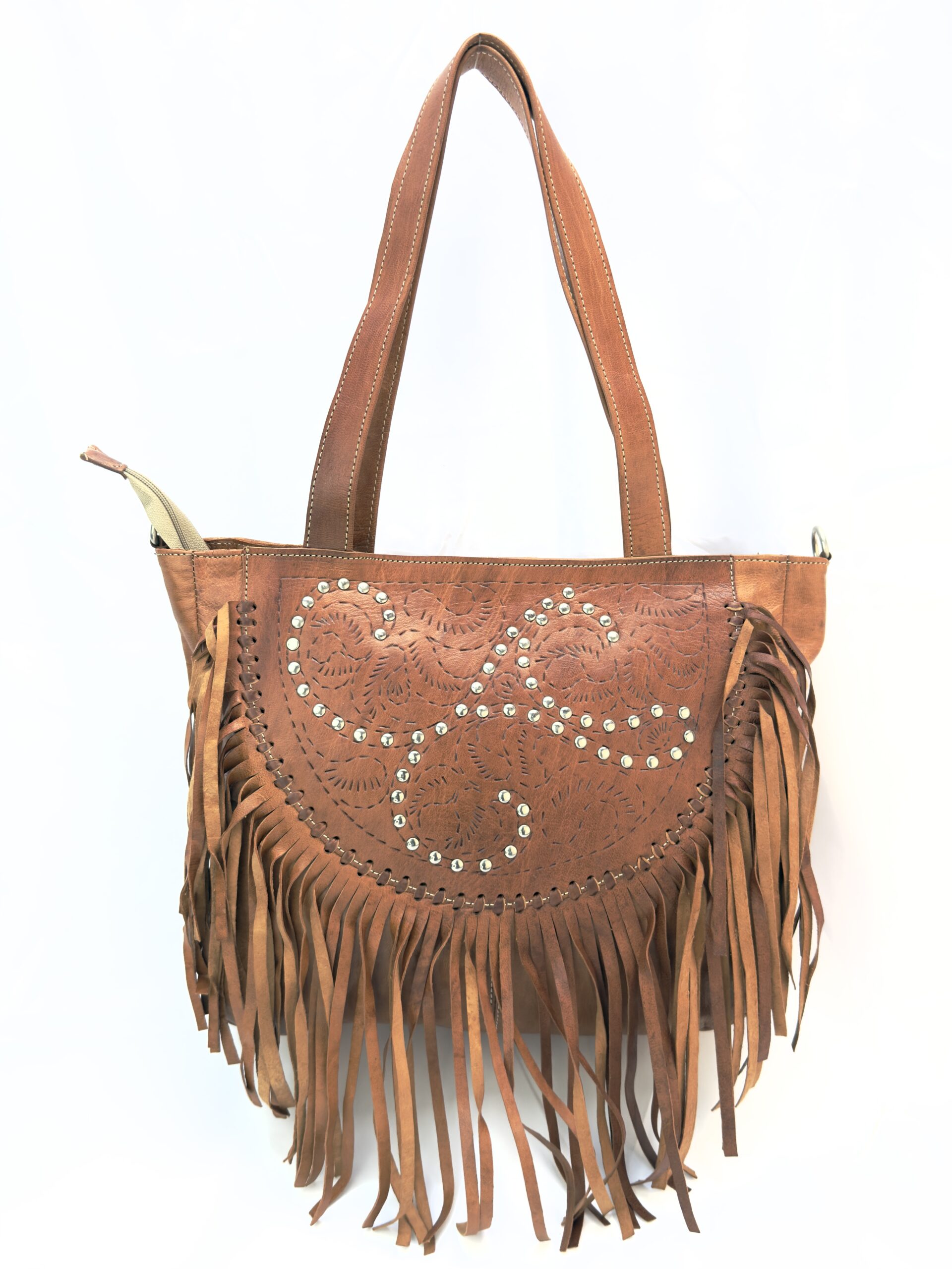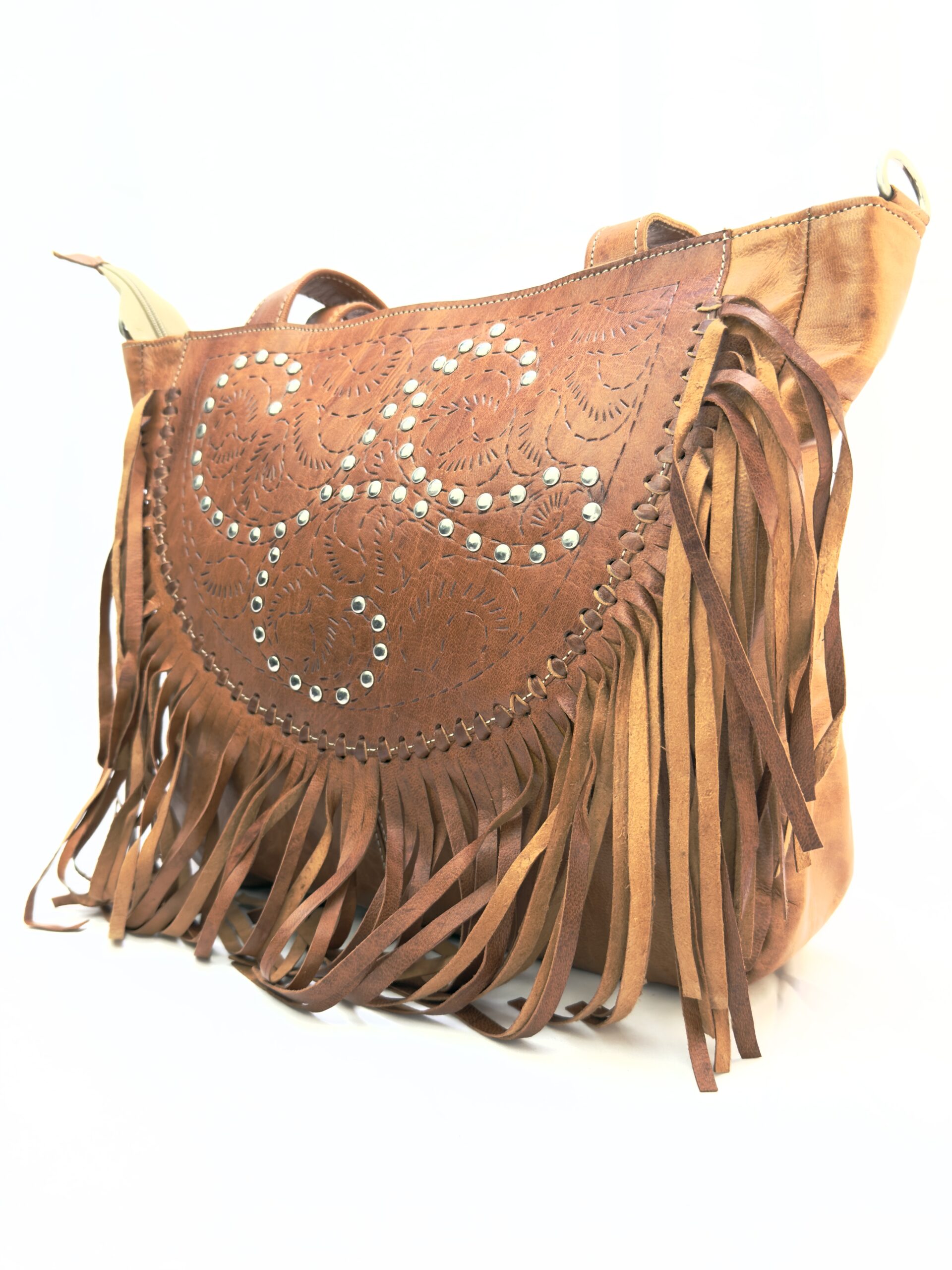 ¡Hazte con este increíble bolso bandolera de cuero con flecos y remaches, un verdadero tesoro artesanal!