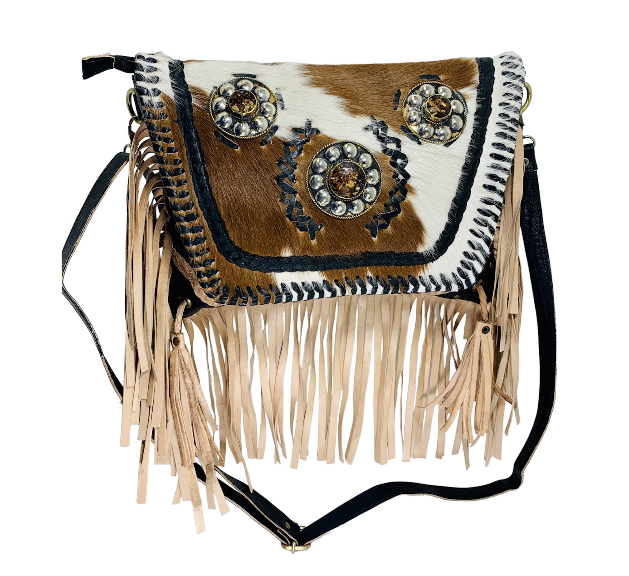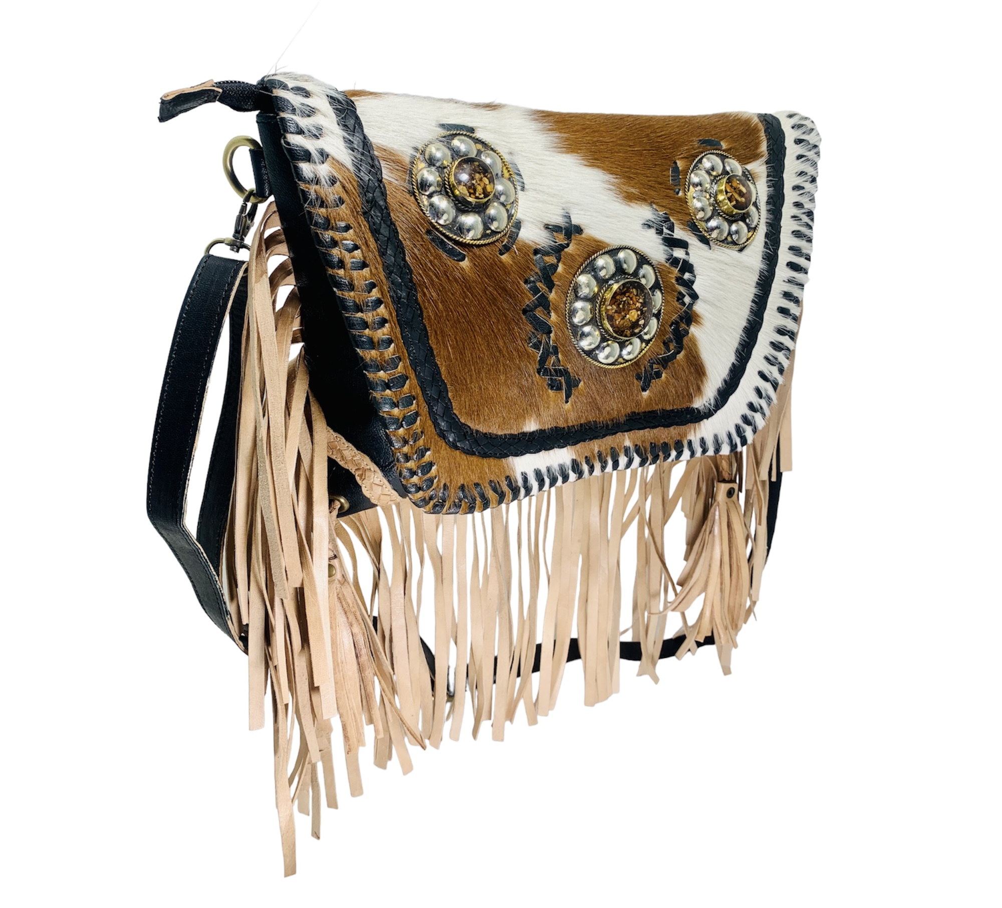 Bandolera tres chapas con flecos en color negro y pelo animal print para darle un toque boho chic.