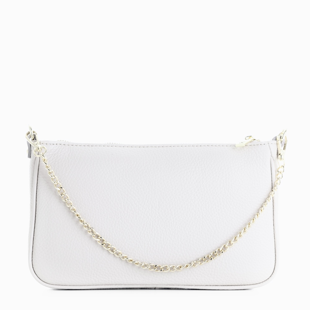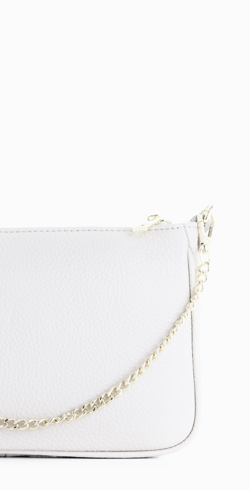 Este bolso de mano destaca por su diseño sofisticado y versátil. Fabricado en piel texturizada de alta calidad en un elegante tono elegante, combina a la perfección con cualquier look. Su cadena dorada desmontable aporta un toque de glamour y permite llevarlo cómodamente al hombro o como clutch.