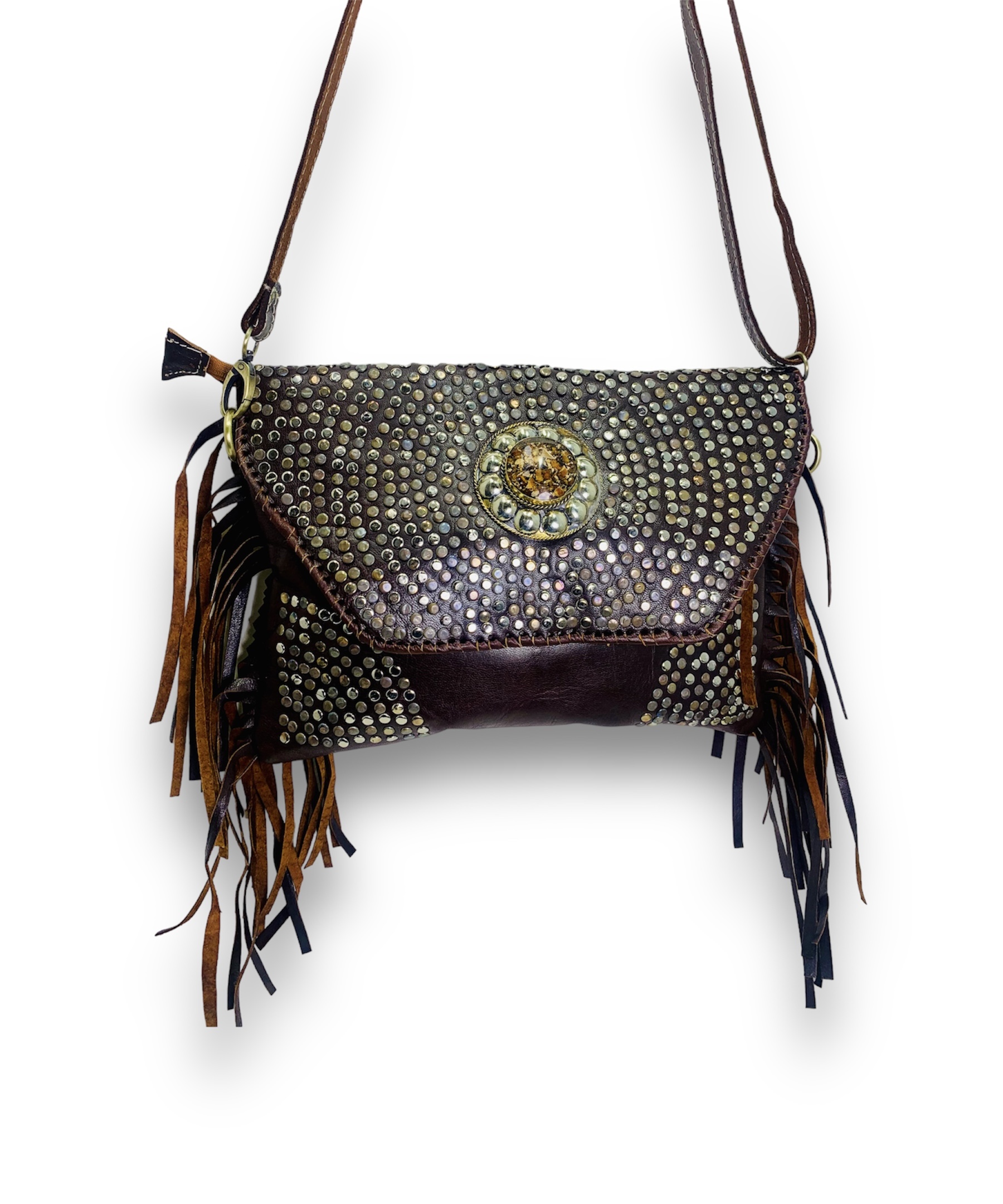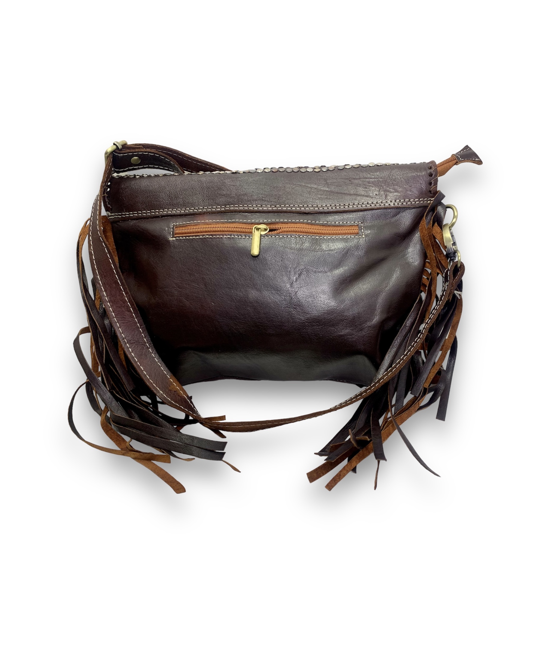 Los detalles decorativos incluyen flecos de cuero de 20 cm en los extremos y un chapón decorativo de alpaca y tachas en la parte central, agregando un toque de estilo único. Disponible en tono camel, este bolso puede ser llevado cómodamente como bolso de hombro o como bandolera gracias a su correa ajustable.