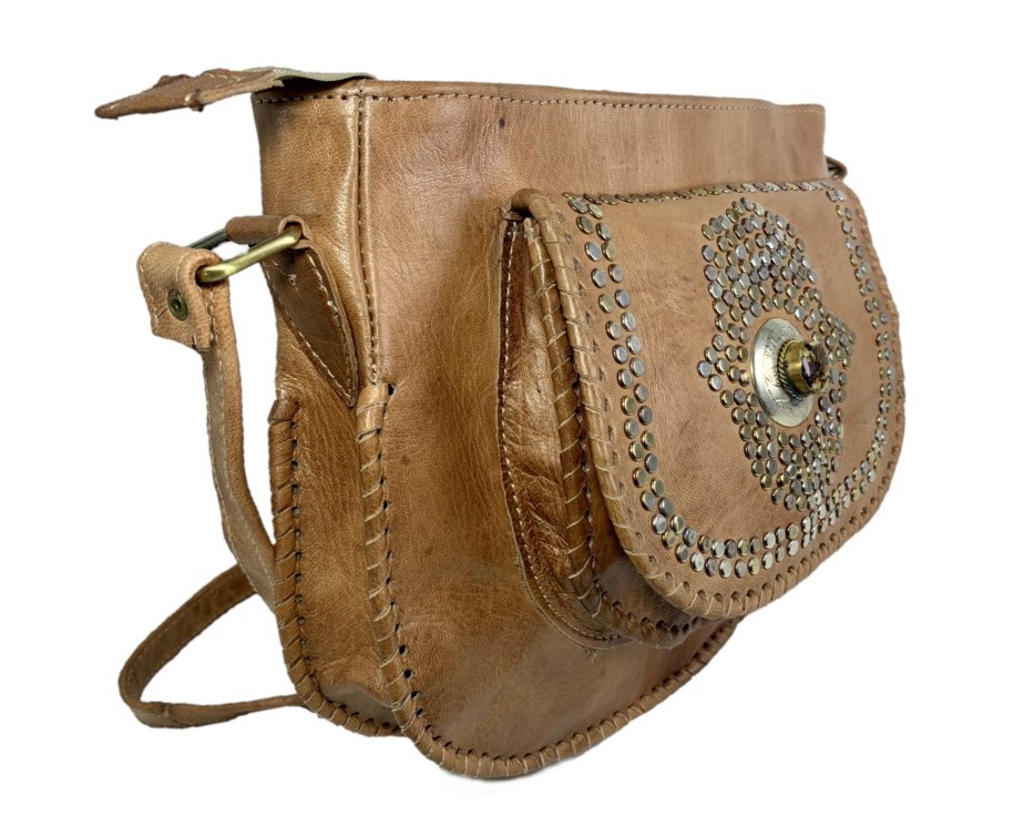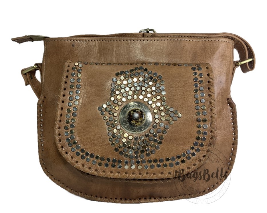 Bolso de cuero con bolsillo exterior y decoración mano de Fátima.