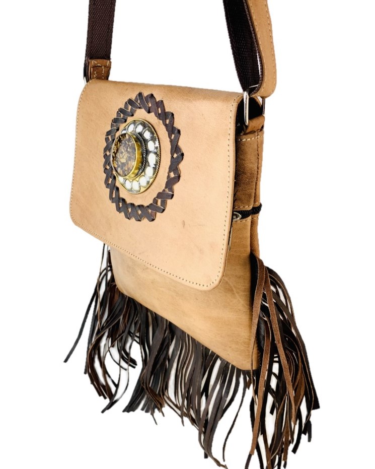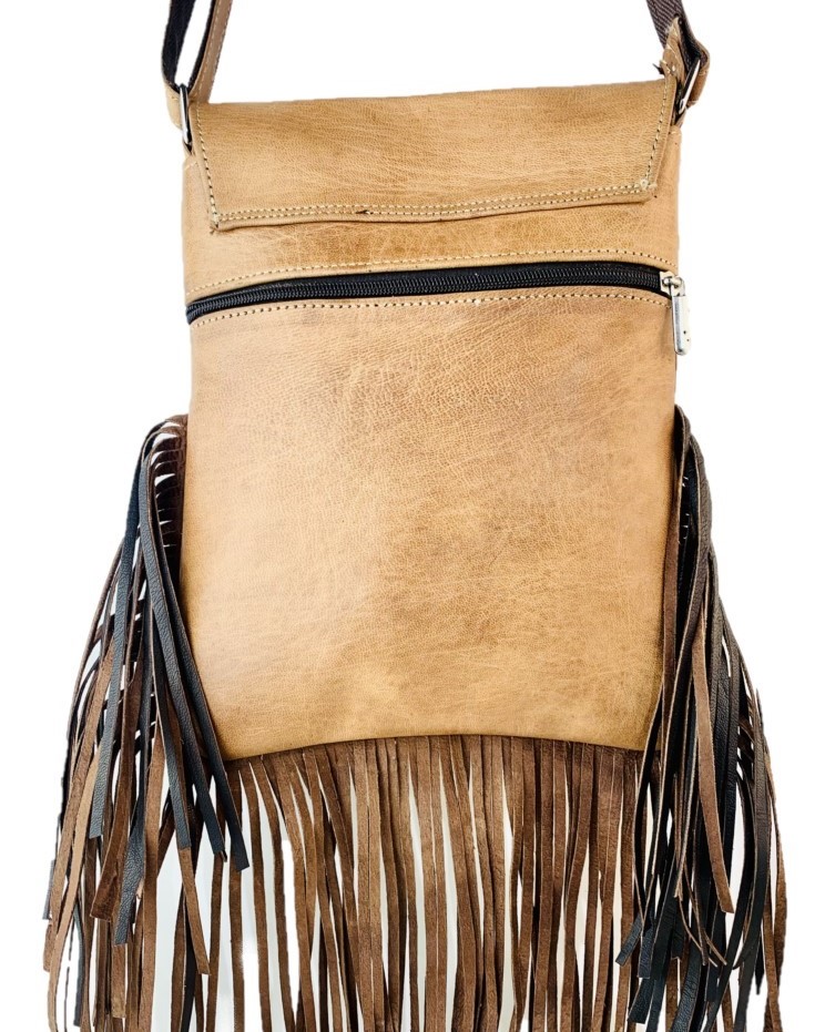 Bolso bandolera de piel con flecos 100% artesanal.