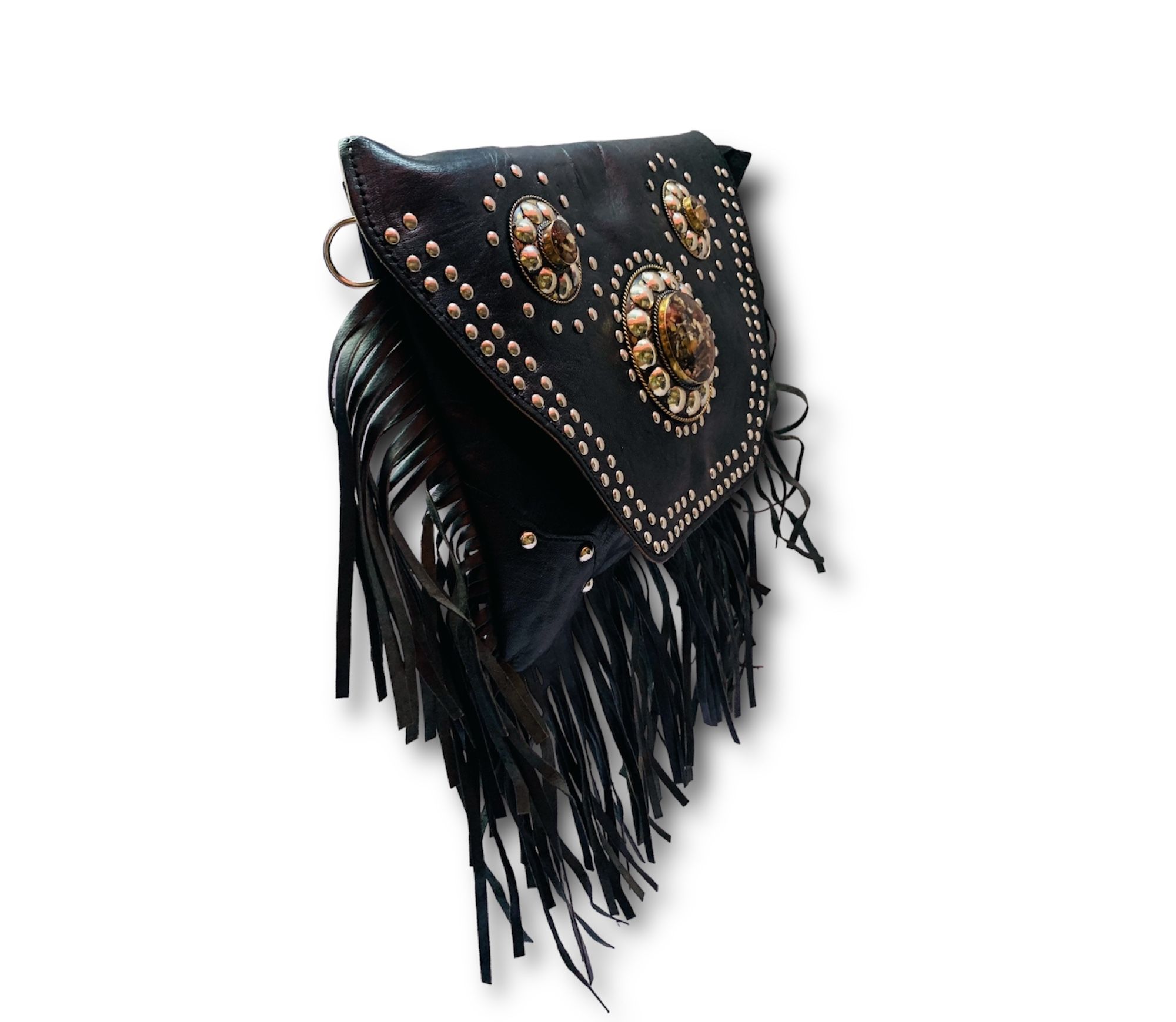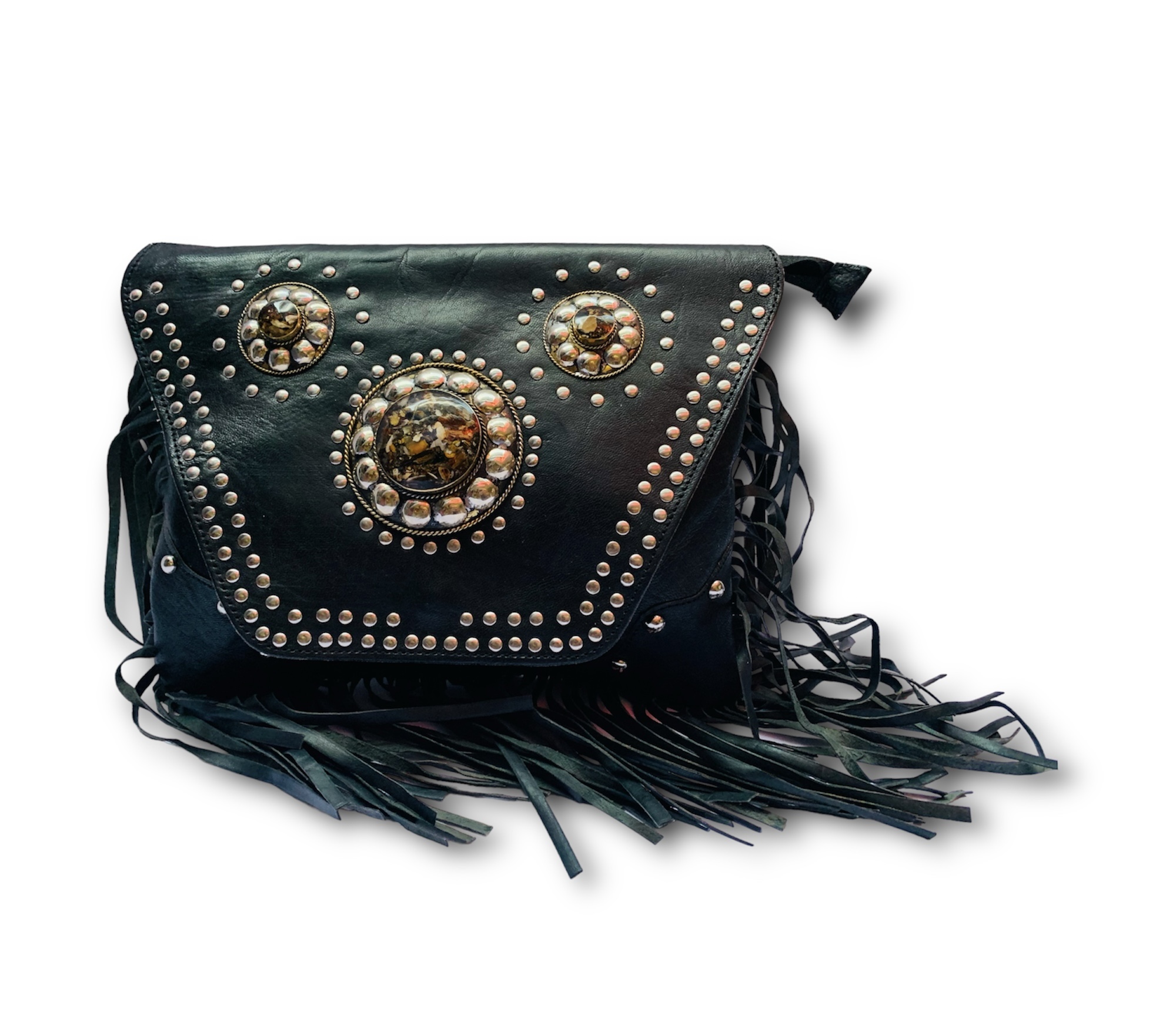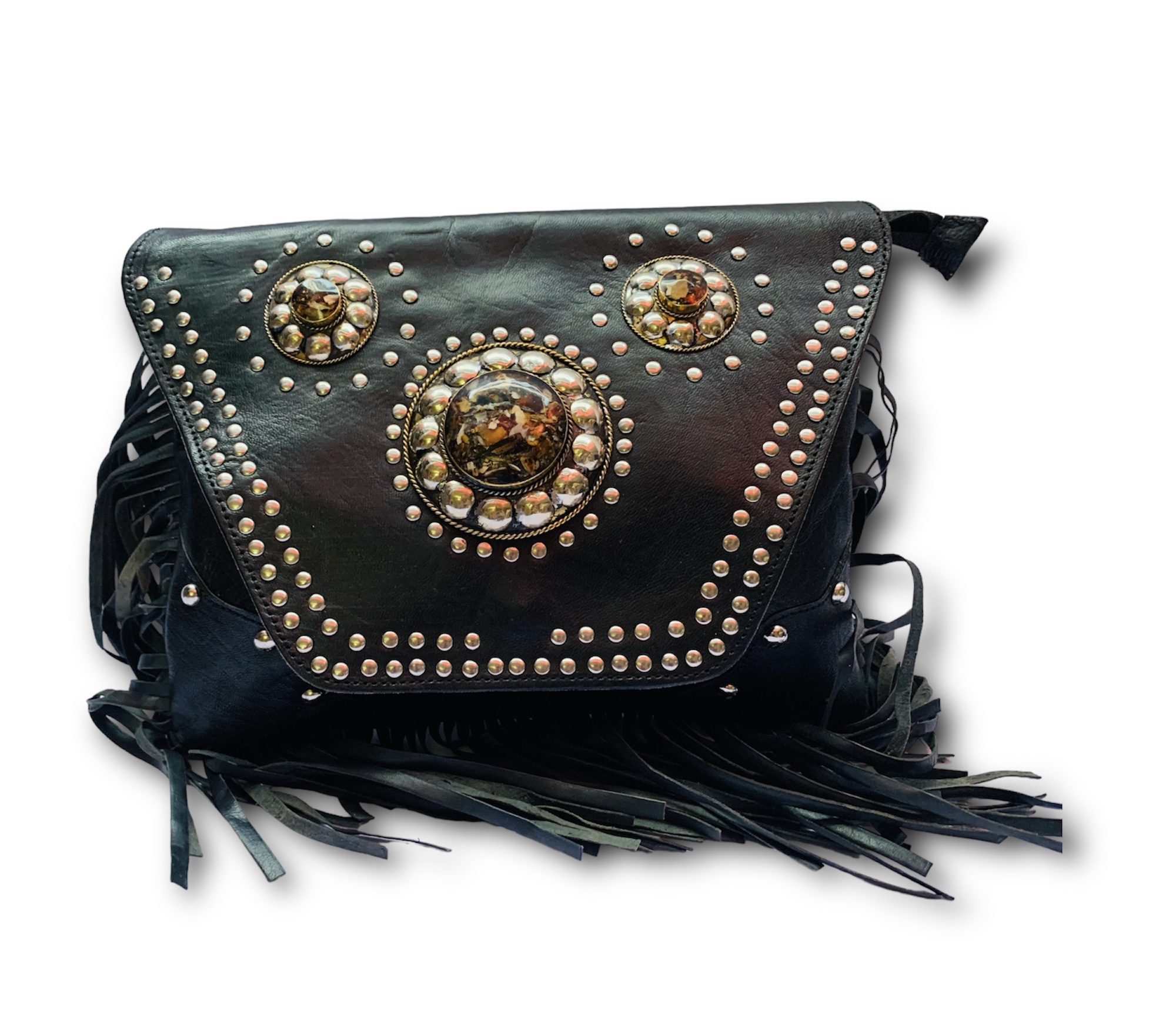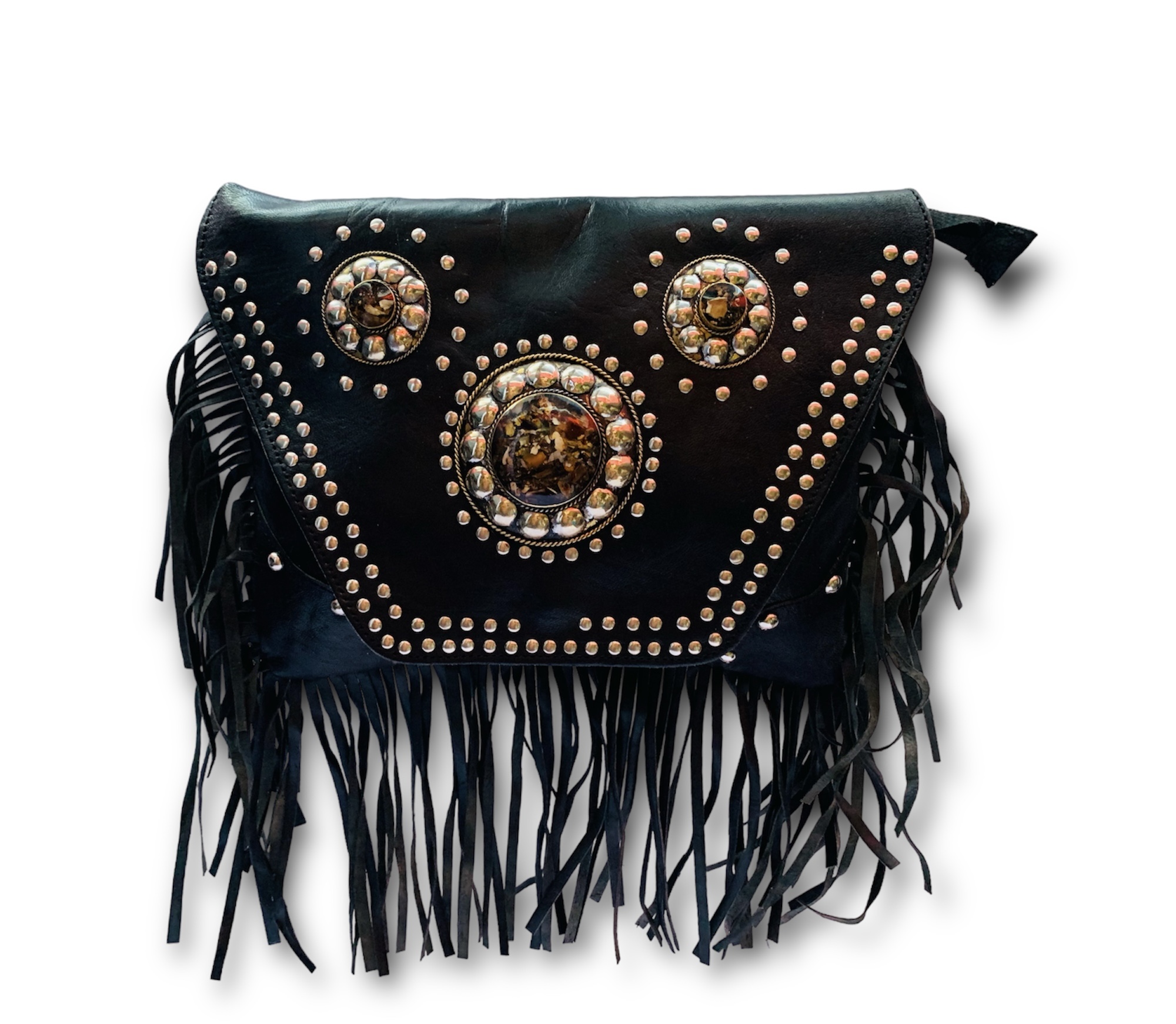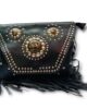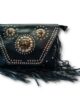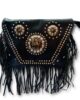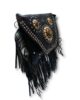 ¡Hazte con esta bandolera de tres chapas con flecos en color negro y remaches para lucir un estilo boho chic inigualable!