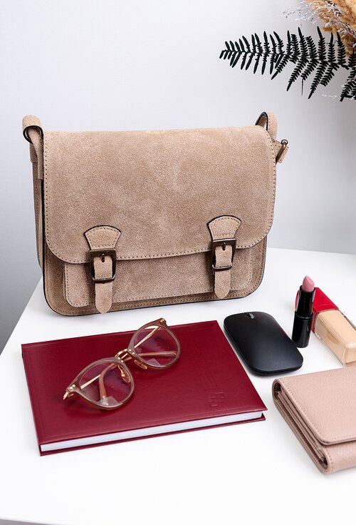 Bolso bandolera de piel de ante taupe diseño Italiano, espacioso y funcional Will