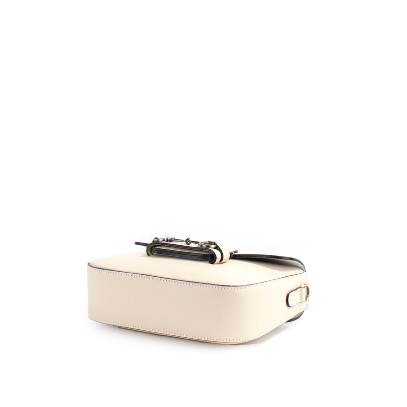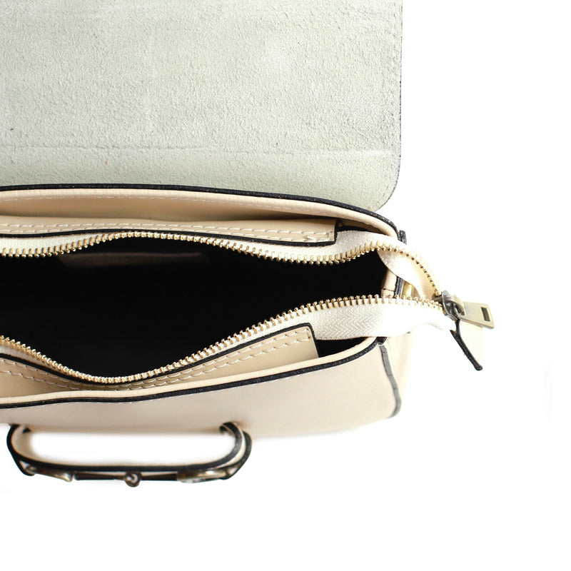 Detalles en oro antiguo y una correa de piel no ajustable aportan un toque clásico y refinado, mientras que su cierre de solapa entrelazada y cremallera garantizan seguridad y practicidad. El interior, forrado en tela, incluye un bolsillo con cremallera para organizar tus esenciales.