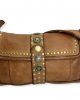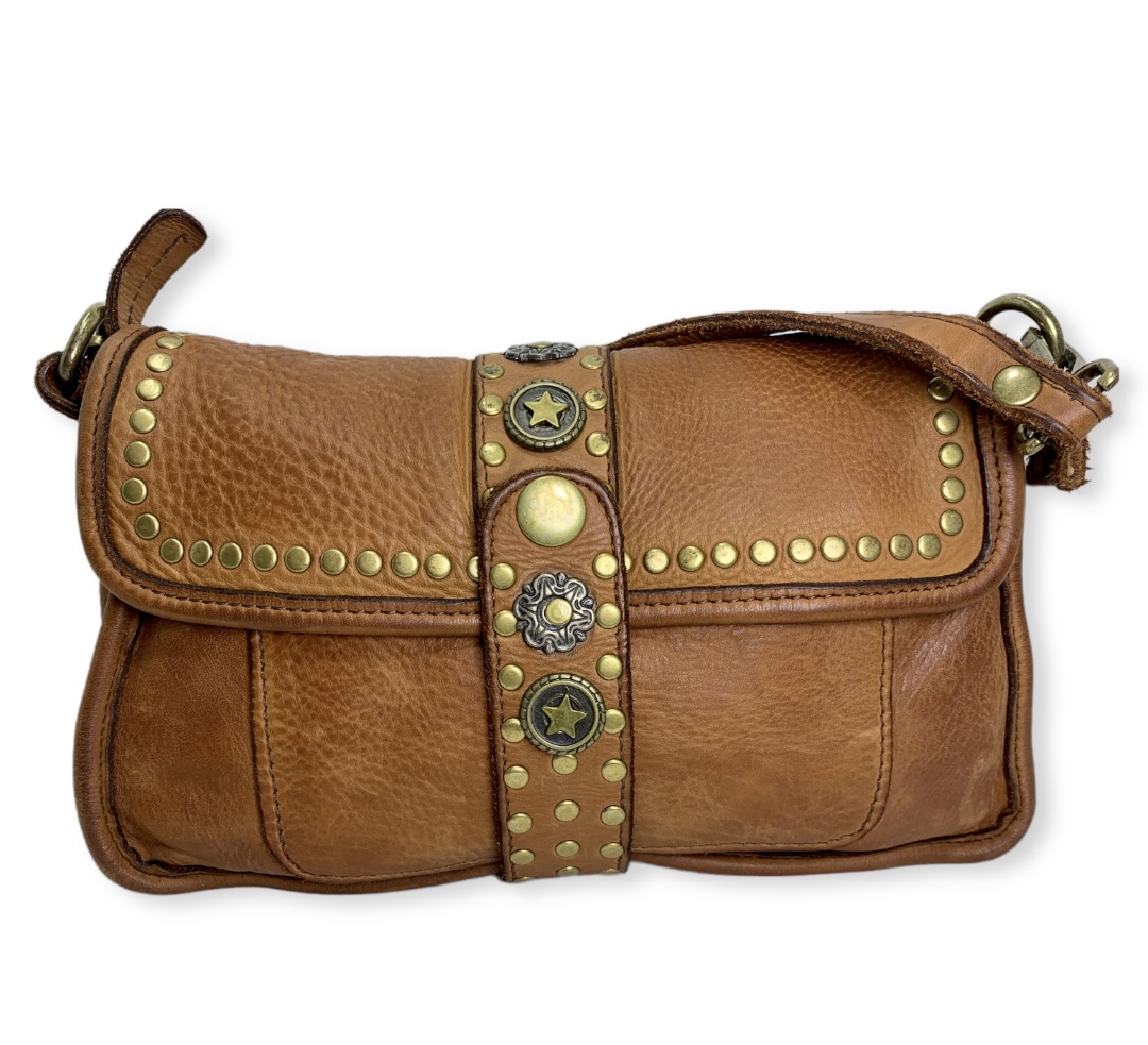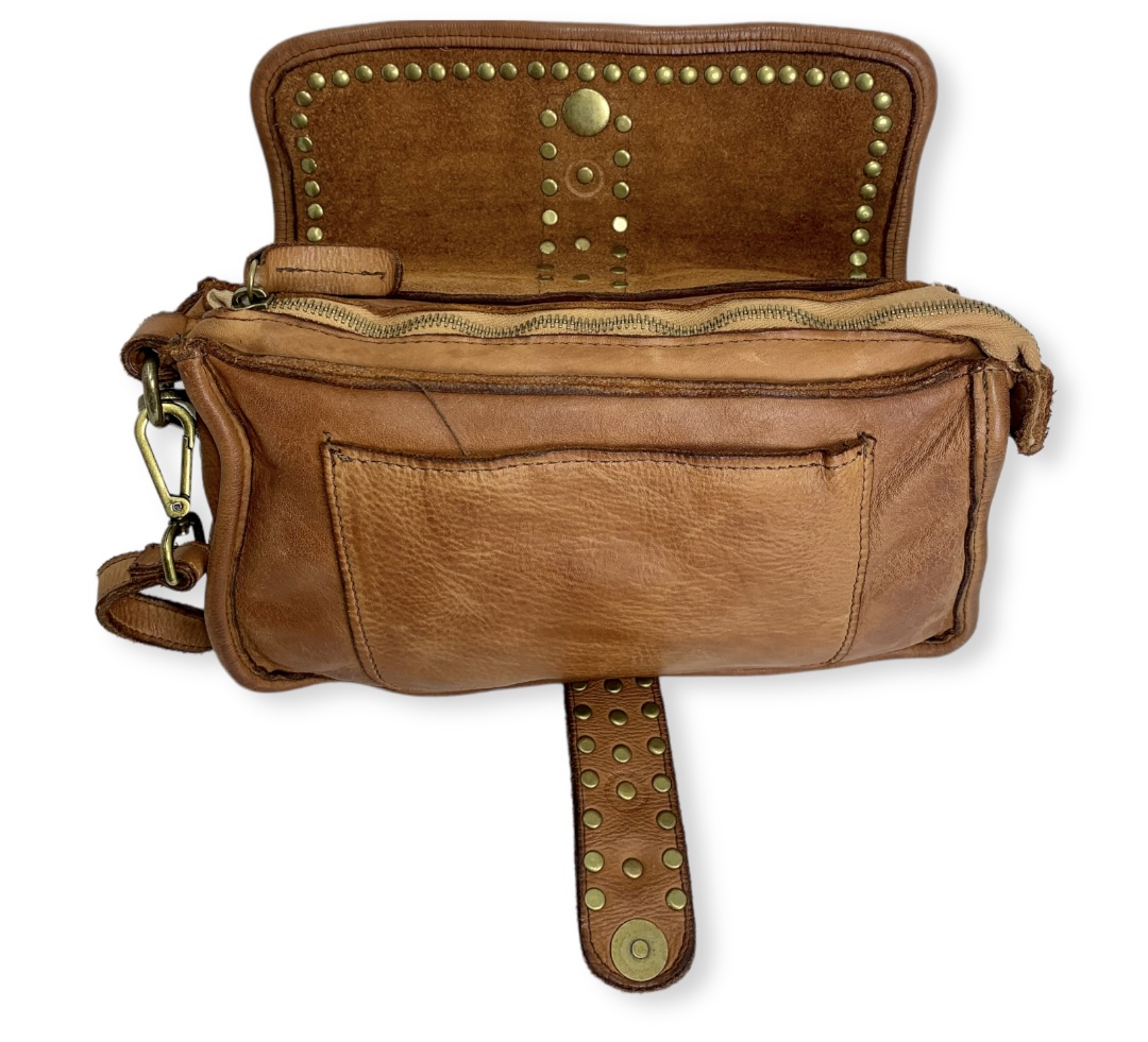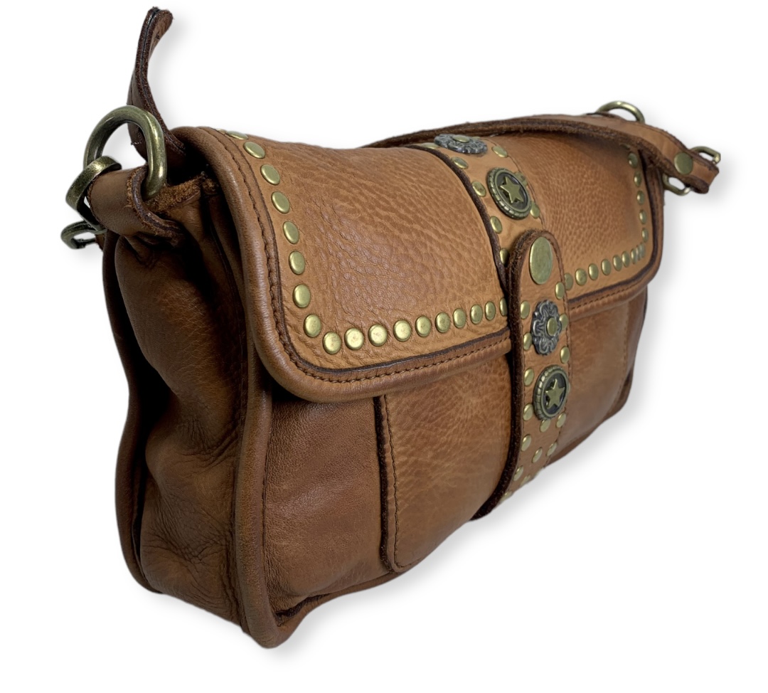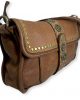 Bolso de piel Italiana para del día y la noche con nuestro impresionante bolso y bandolera de piel envejecida. Con detalles de tachuelas de latón envejecido en el cierre de la solapa superior y muchos bolsillos y secciones interiores para mantenerte organizado.