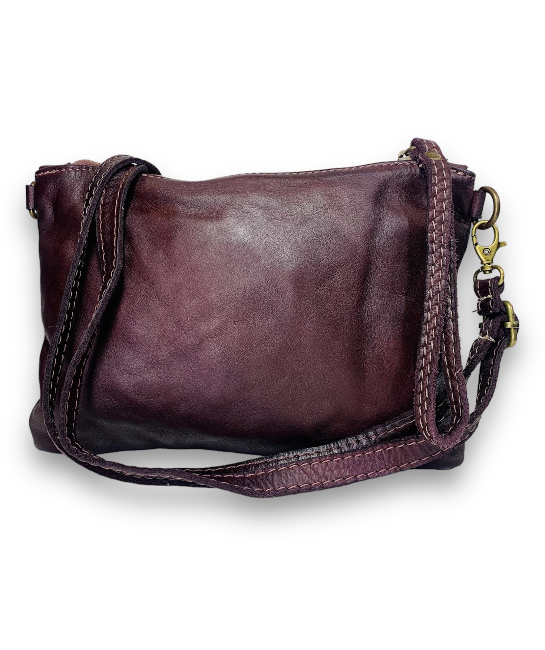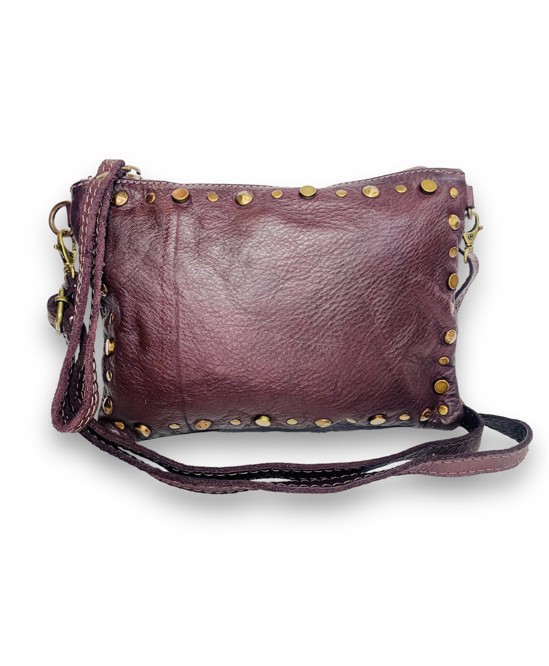 Sé el primero en valorar “Bolso bandolera pequeña de piel burdeos italiana con tachas Sofia”