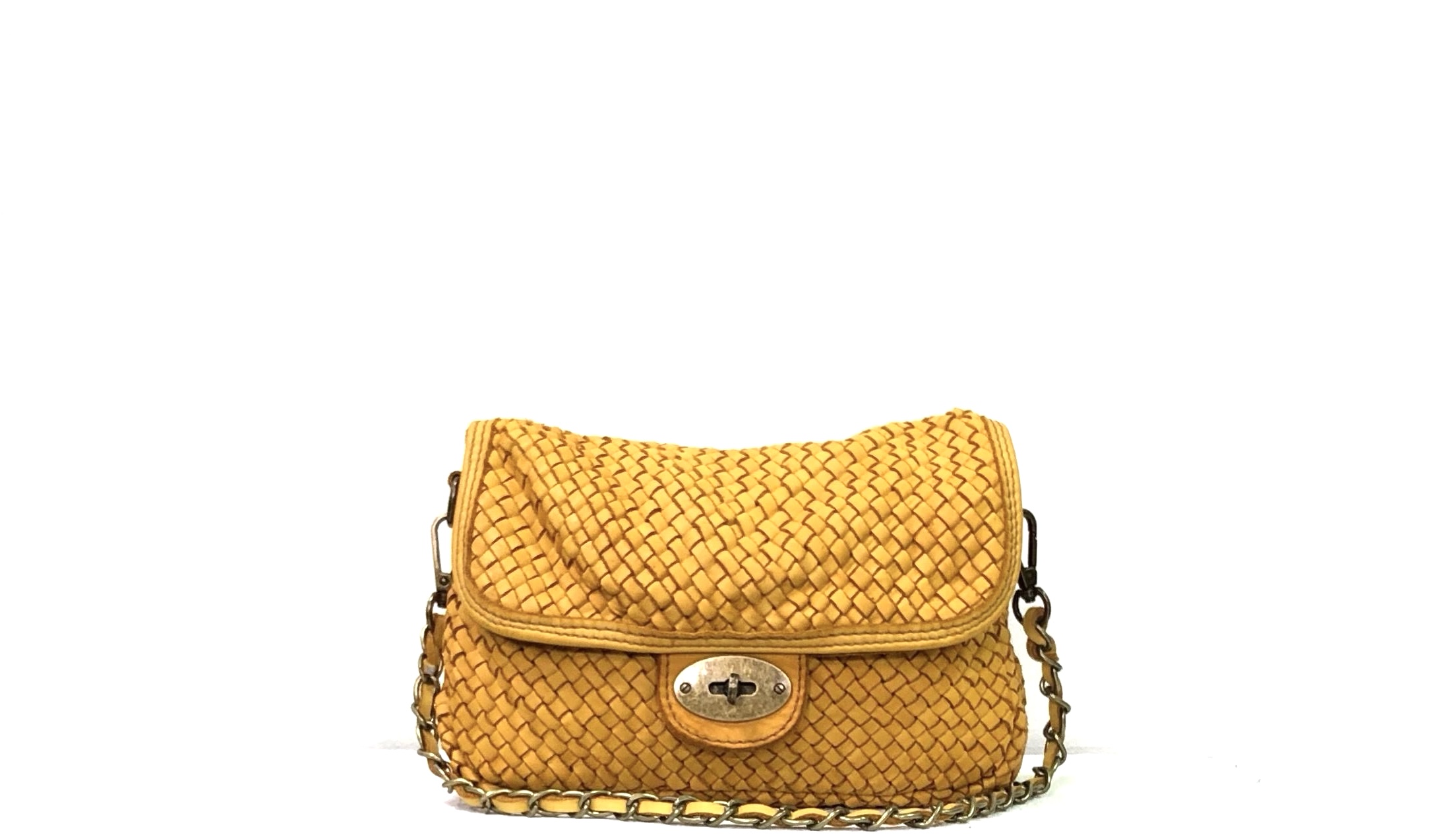 Este bolso de piel trenzada es un accesorio refinado que no pasará desapercibido. El tejido trenzado es el protagonista, destacando por su excepcional suavidad y elegancia. Viene equipado con una cadena bronceada con cuero en el interior que permite usarlo como bandolera.