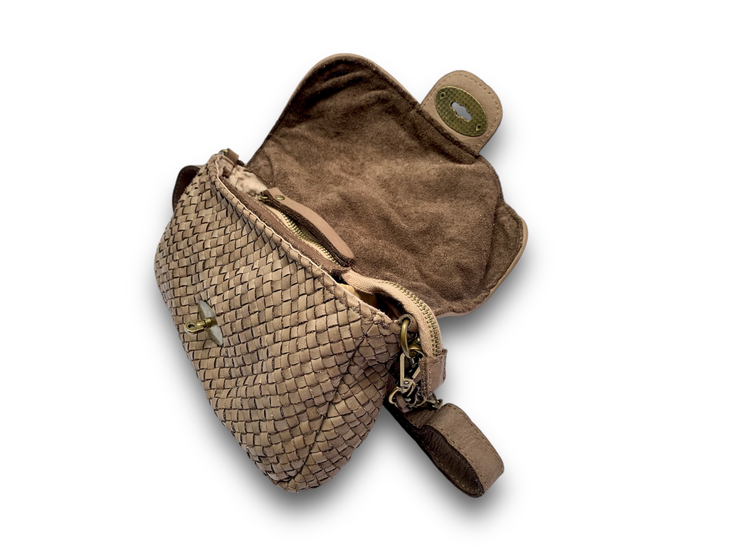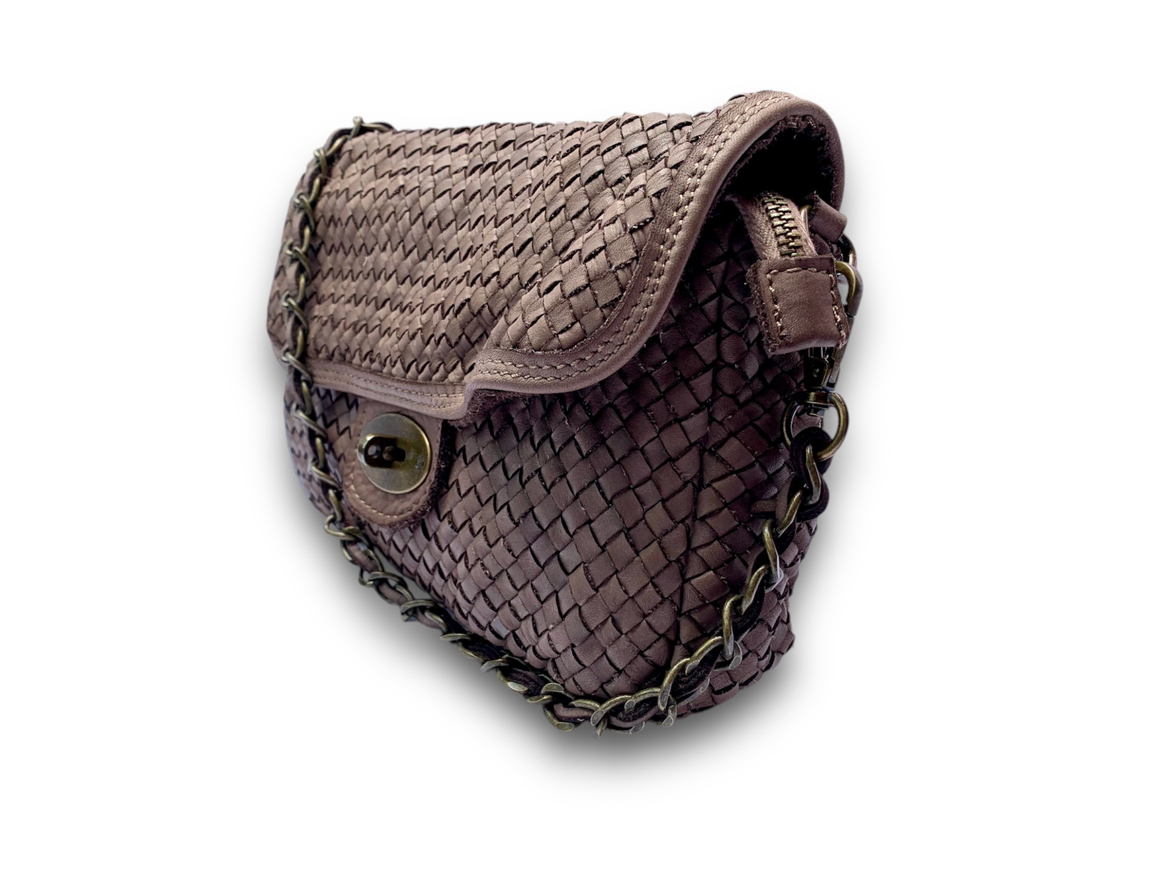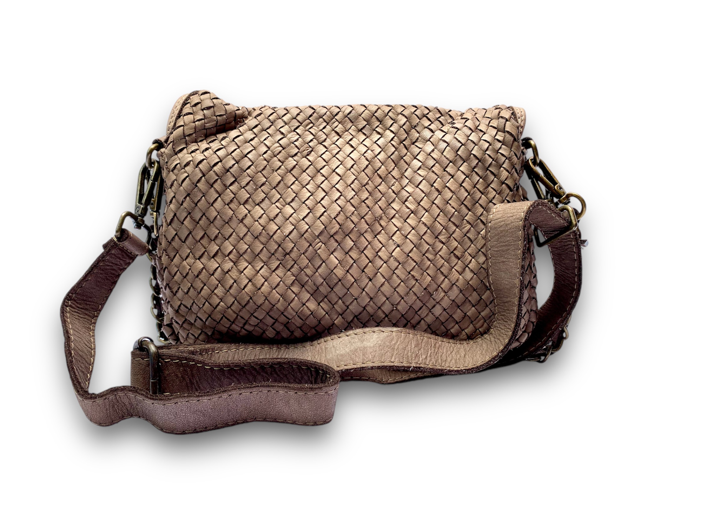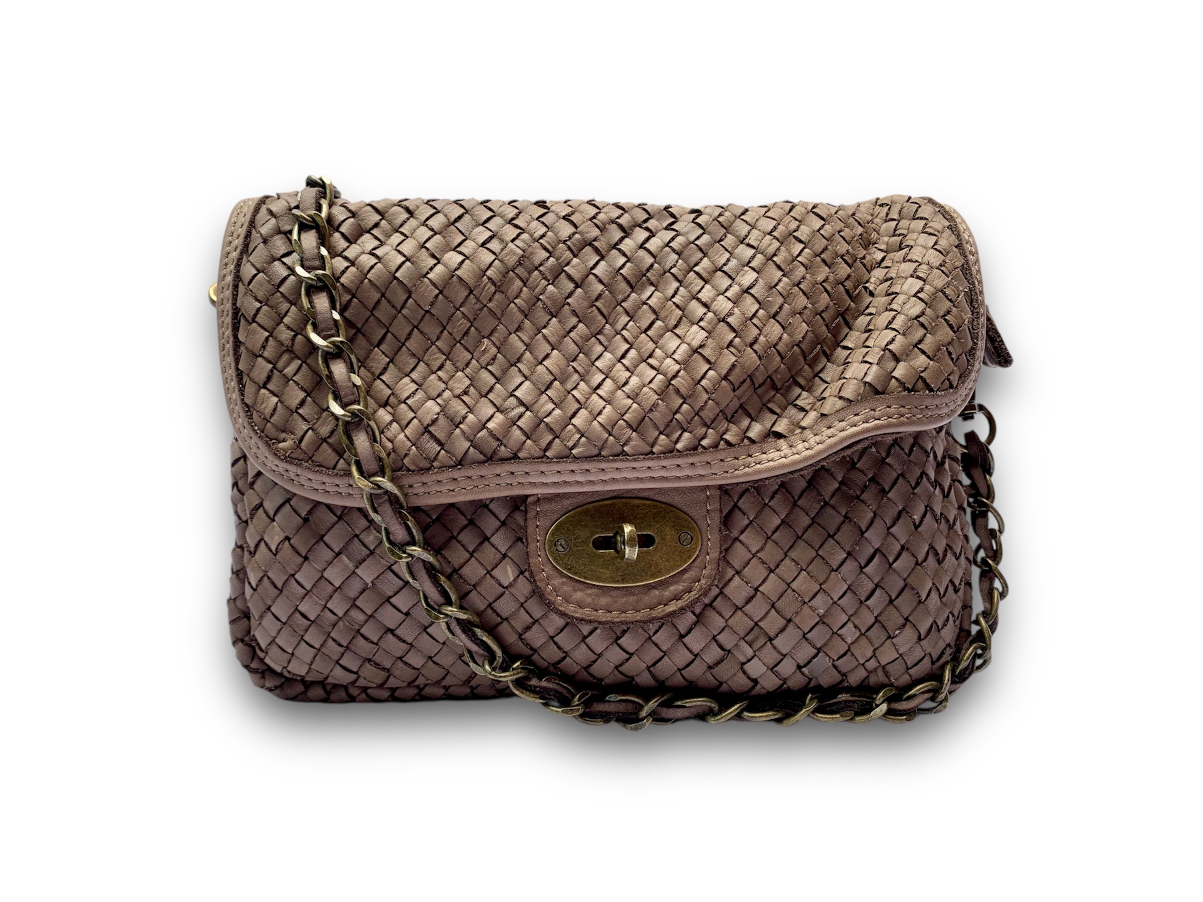 Este bolso de piel trenzada es un accesorio refinado que no pasará desapercibido. El tejido trenzado es el protagonista, destacando por su excepcional suavidad y elegancia. Viene equipado con una cadena bronceada con cuero en el interior que permite usarlo como bandolera.