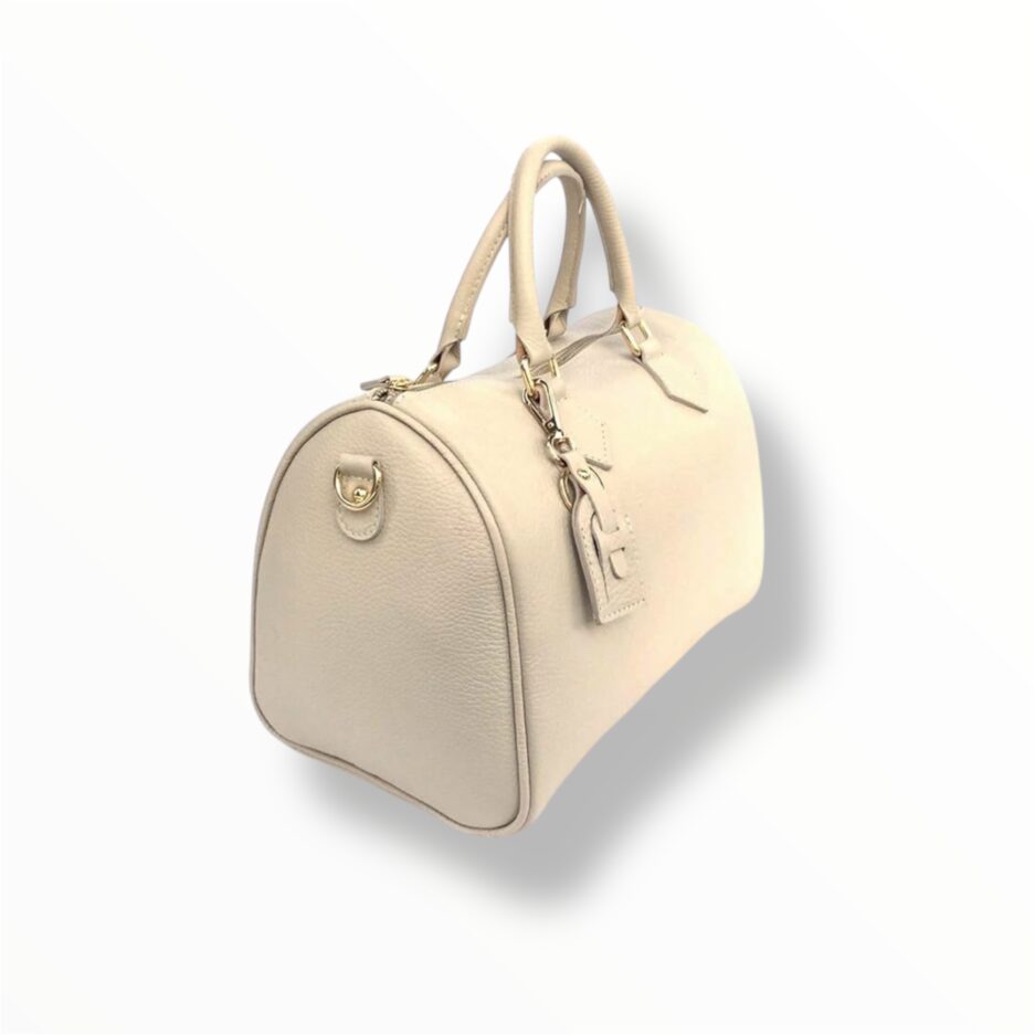 Viaja con estilo y comodidad con el bolso de viaje pequeño de cuero. Fabricado en piel de becerro italiana, ofrece un diseño elegante y versátil, ideal para cualquier viajera. Su tamaño compacto (22 x 17 x 9 cm) proporciona un amplio espacio para llevar tus esenciales, mientras que el interior forrado en algodón incluye un bolsillo con cremallera y otro para el móvil, manteniendo todo organizado.