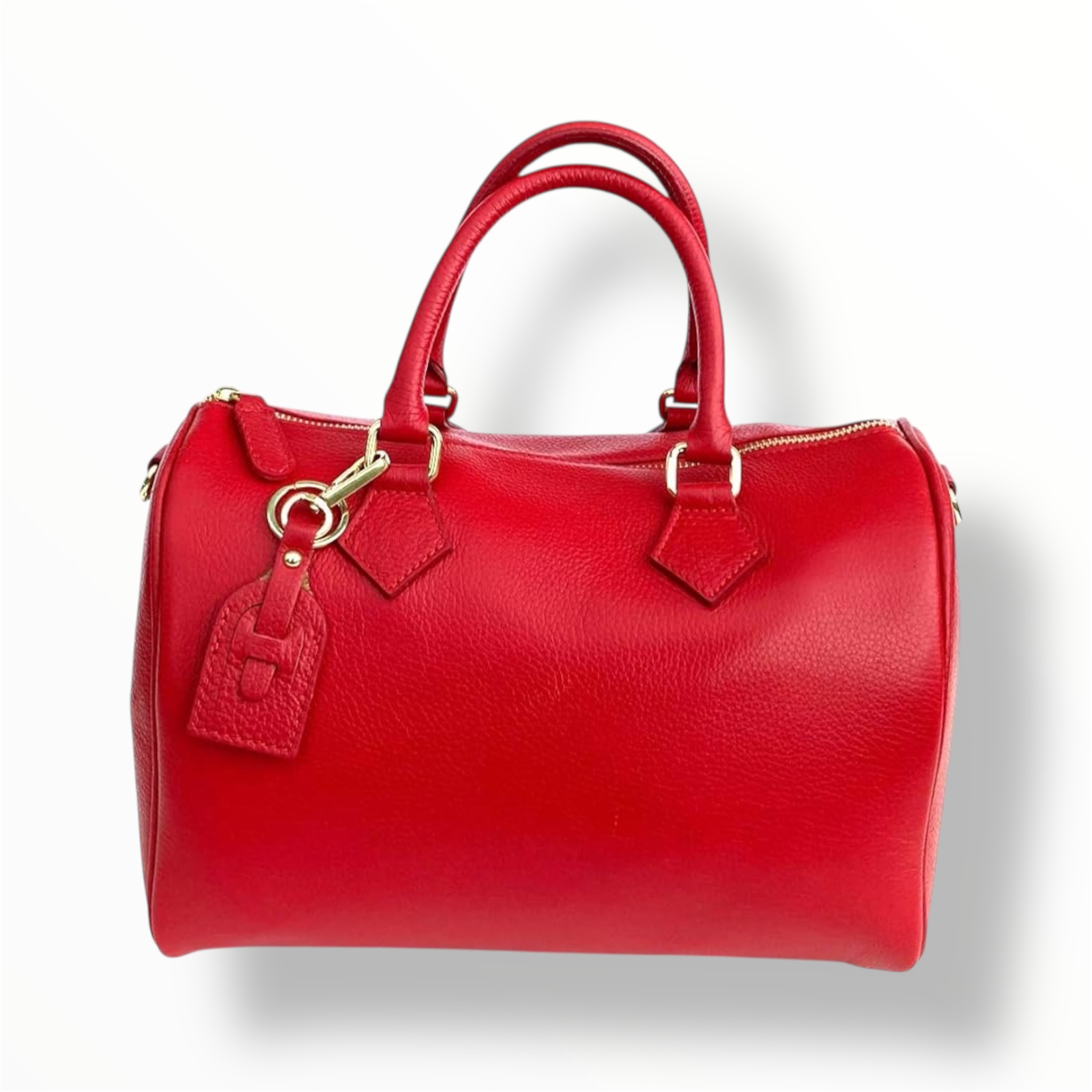 Viaja con estilo y comodidad con el bolso de viaje pequeño de cuero. Fabricado en piel de becerro italiana, ofrece un diseño elegante y versátil, ideal para cualquier viajera. Su tamaño compacto (22 x 17 x 9 cm) proporciona un amplio espacio para llevar tus esenciales, mientras que el interior forrado en algodón incluye un bolsillo con cremallera y otro para el móvil, manteniendo todo organizado.