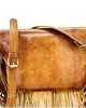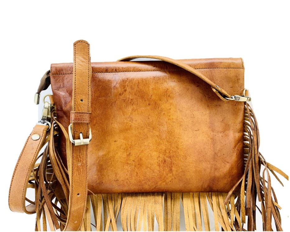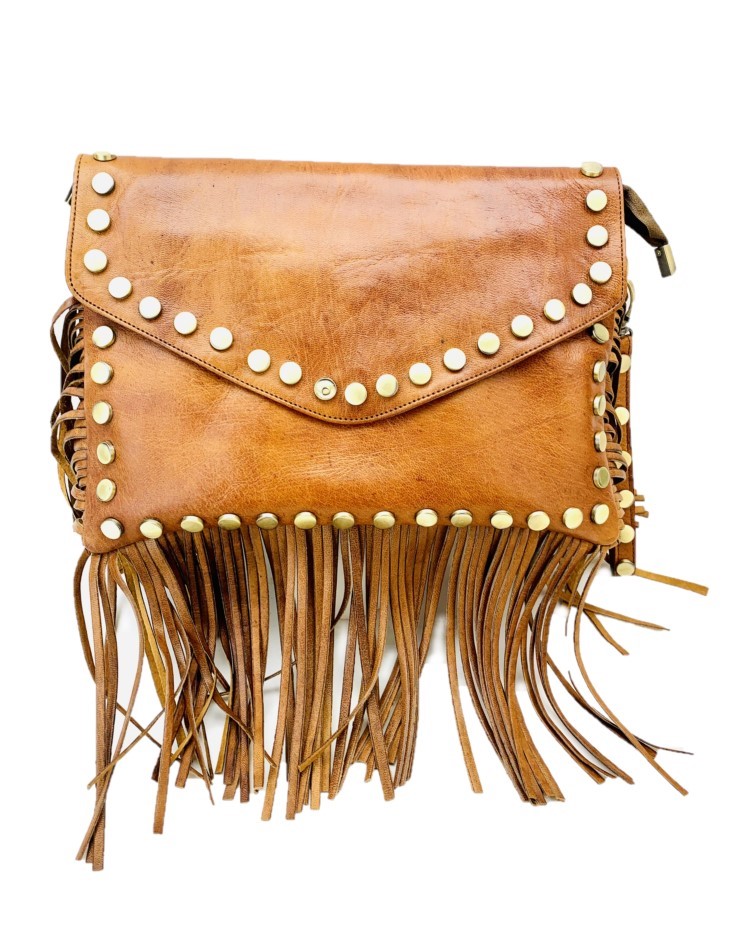 Bolso mujer Clutch en piel con flecos color teja con decoración de tachas y chapón central realizado artesanalmente.