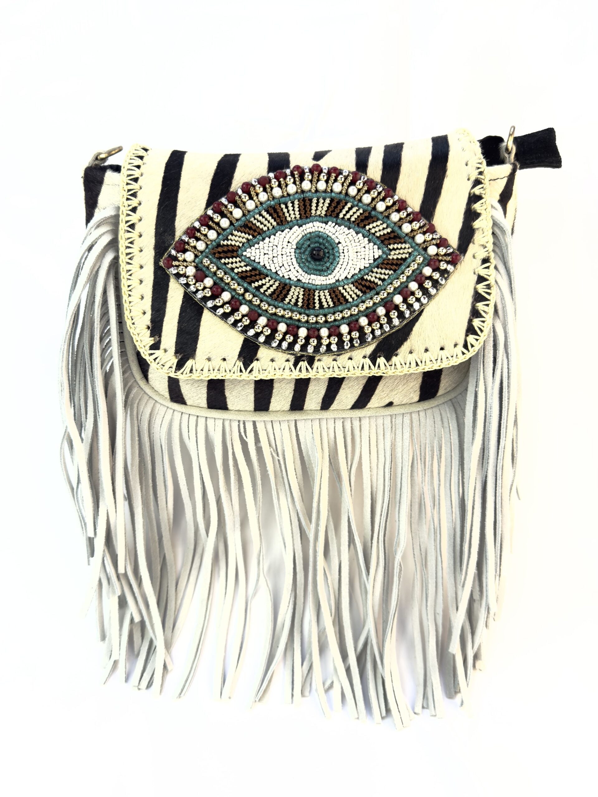 Bolso mujer Clutch en piel con flecos colores blanco y negro con decoración de ojo Turco en la solapa hecho a mano.