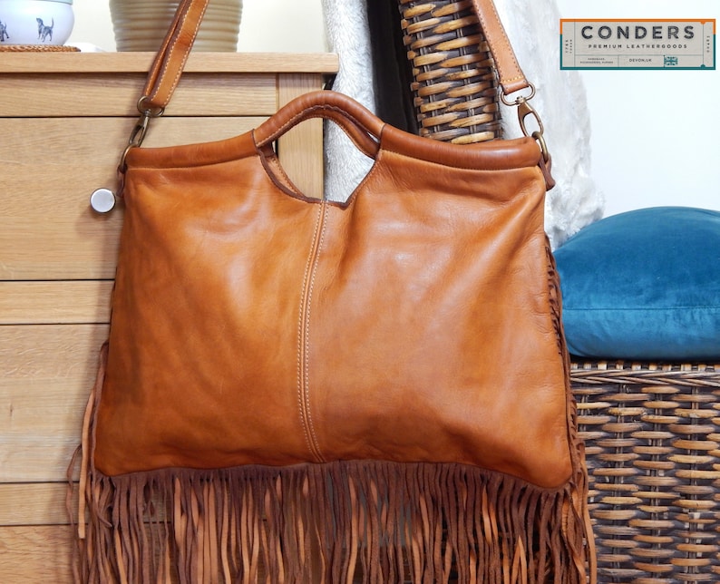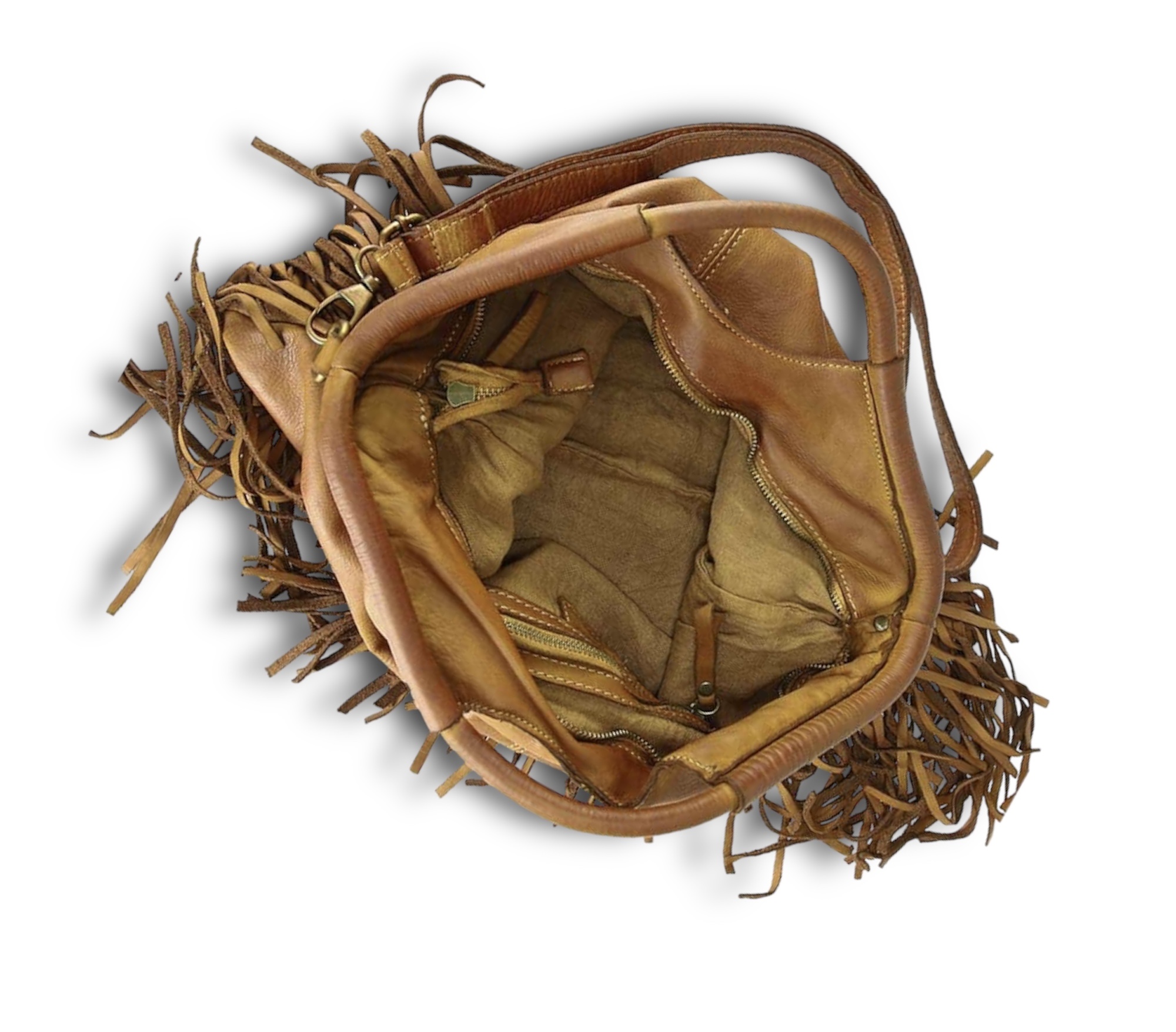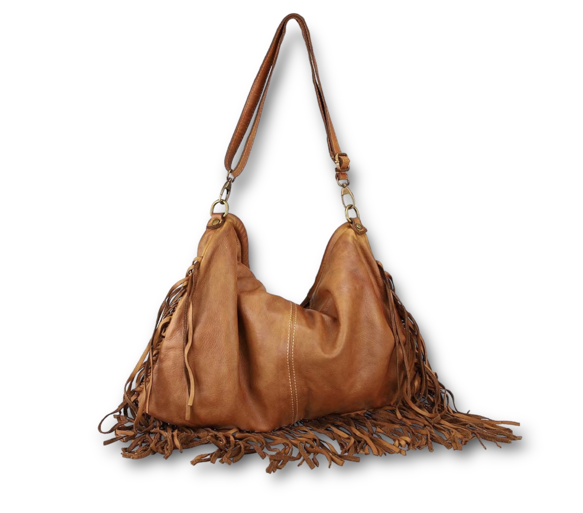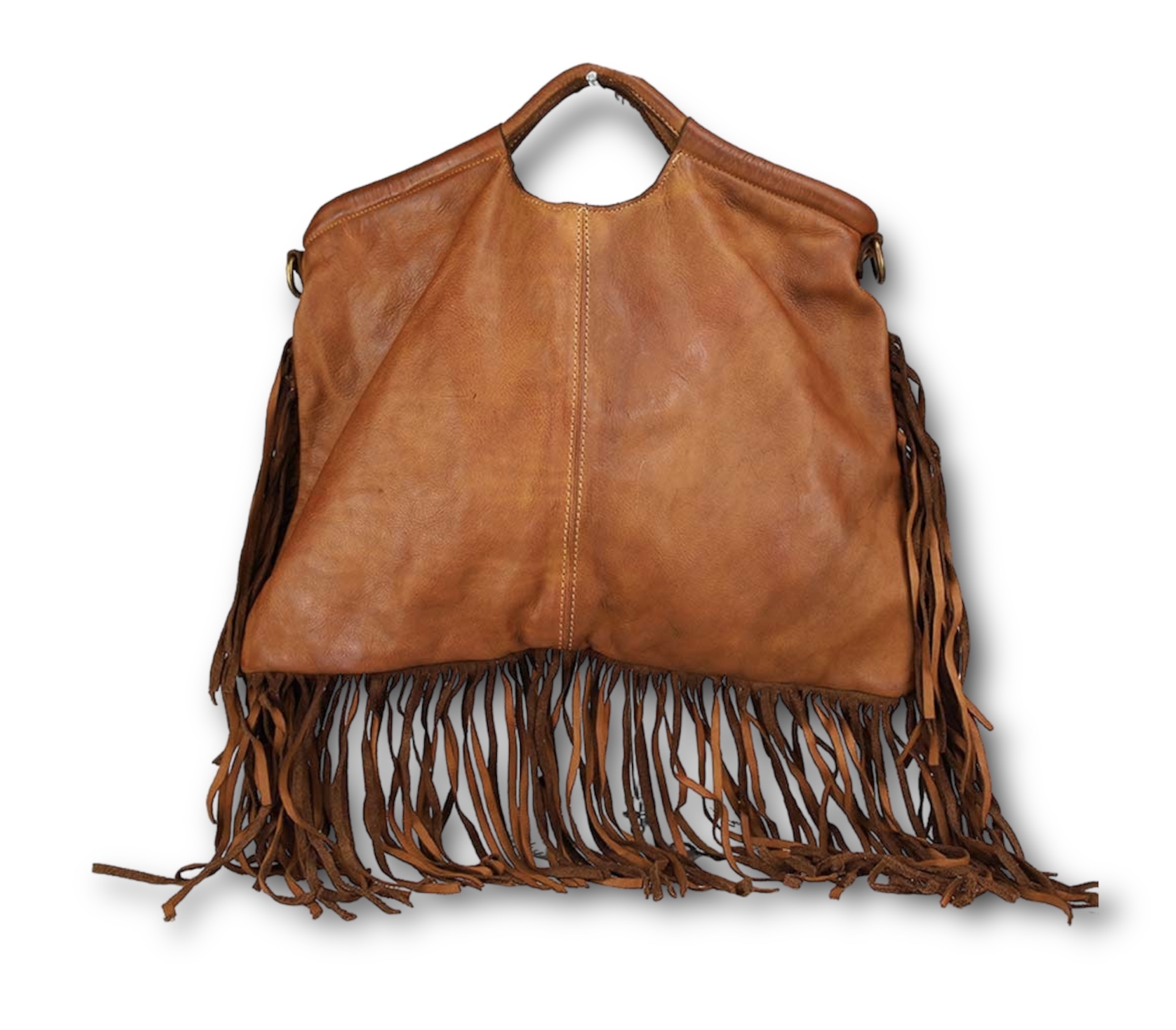 ¡Sumérgete en el estilo boho chic con este increíble bolso de cuero con flecos hecho a mano! Es la pieza perfecta para complementar tu colección de accesorios con un toque único y artesanal.