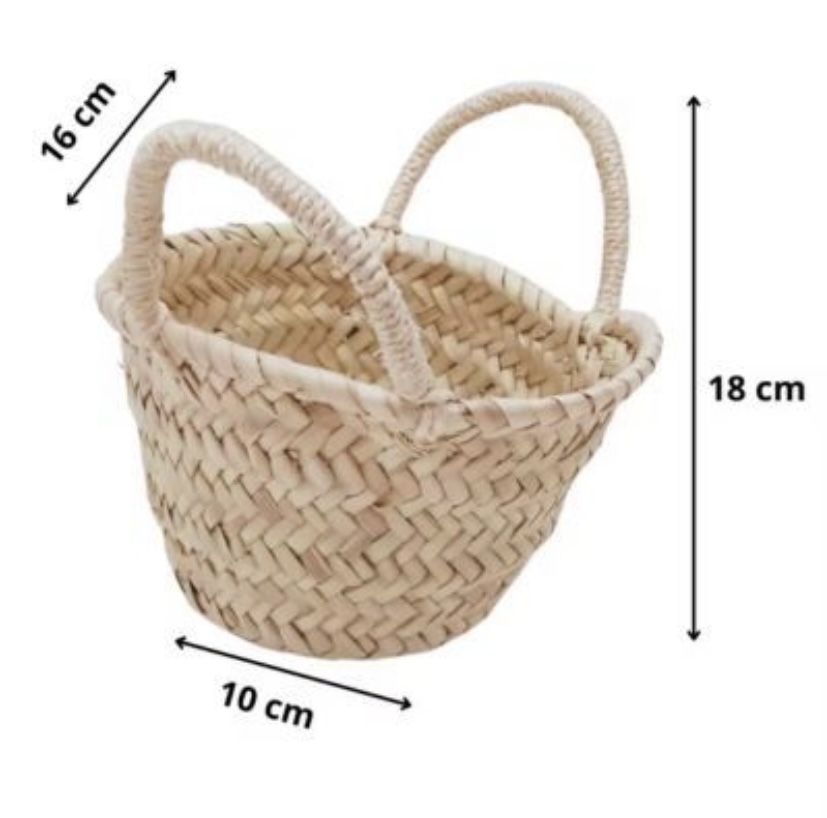 Sus medidas aproximadas son 10x18x16 cm. A tener en cuenta: Cestas hechas a mano a partir de materiales vegetales naturales. Al ser un producto artesano las medidas pueden variar un poco. Cada canasta es única en detalle. El mimbre y la cestería son tendencia todos los Veranos.
