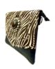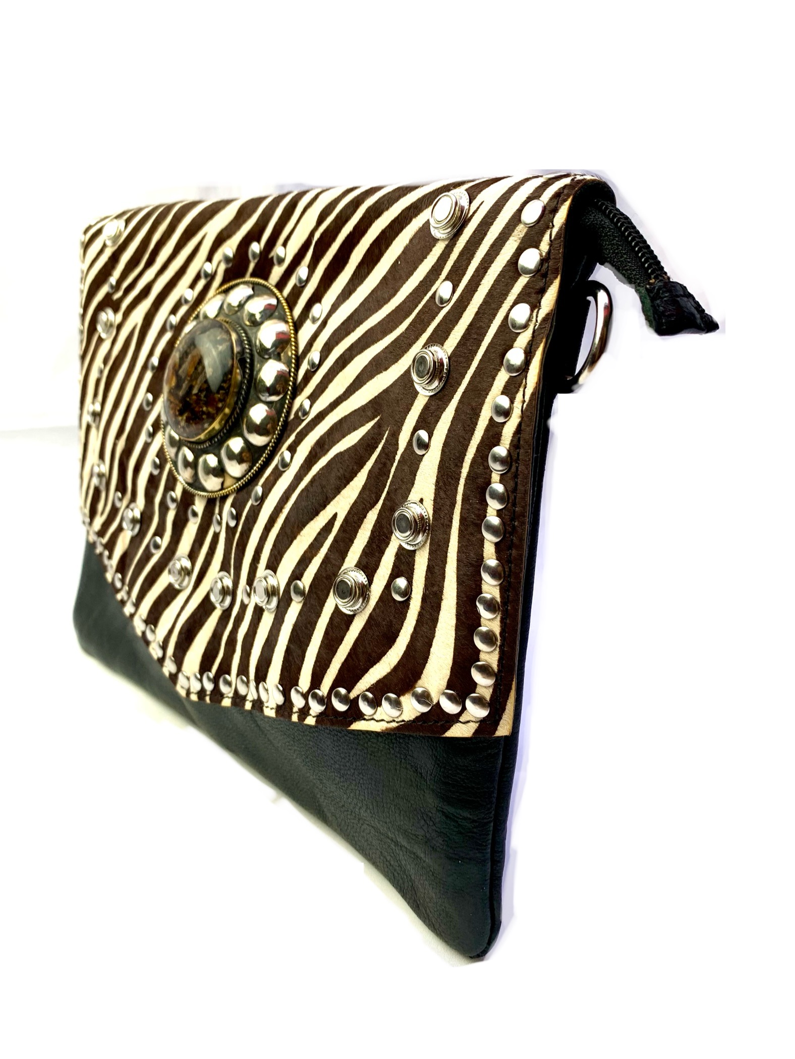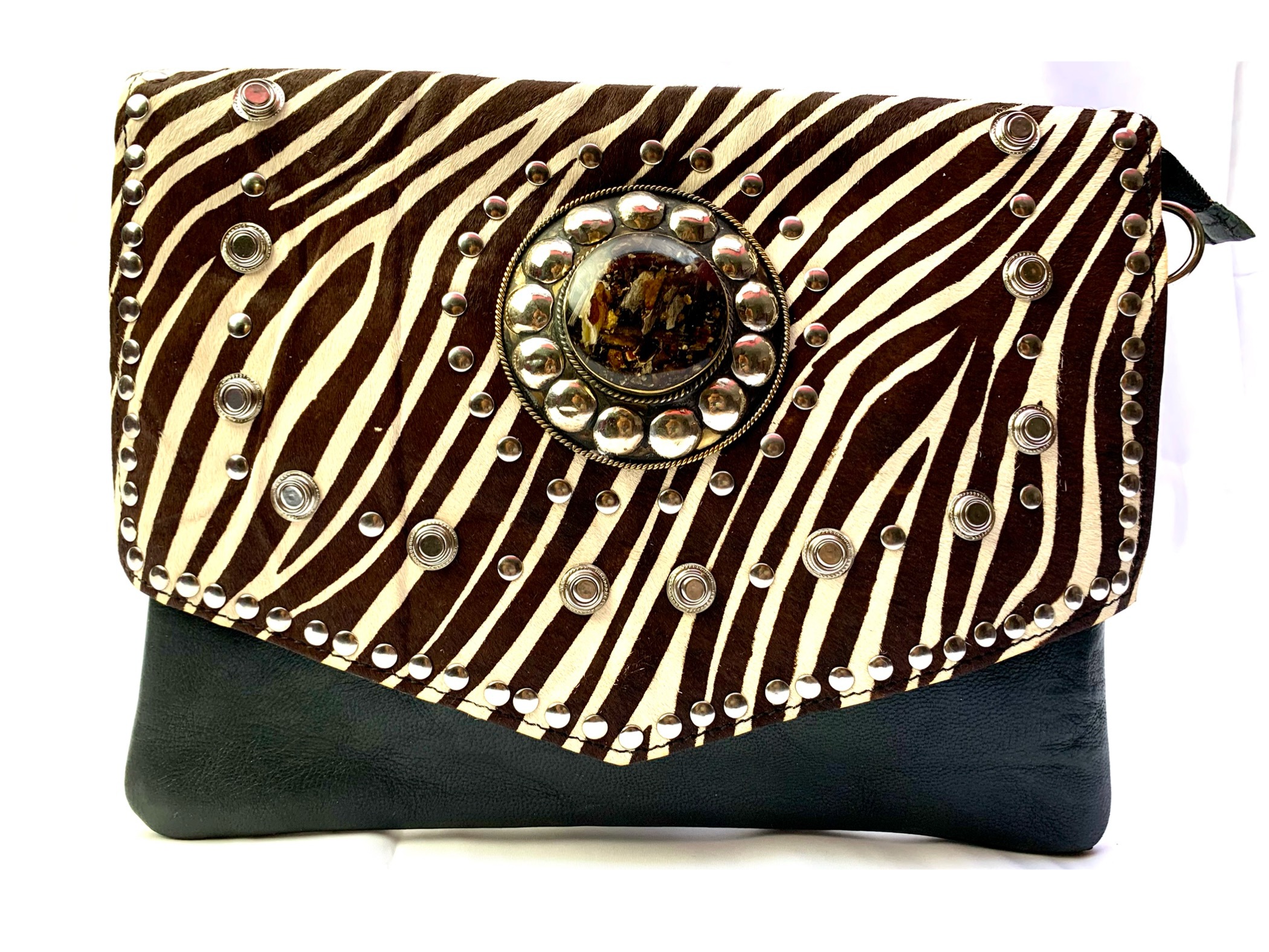 Bandolera y bolso de mano en cuero y pelo animal print CEBRA con tachas, es un modelo elaborado en cuero artesanal.