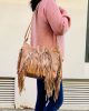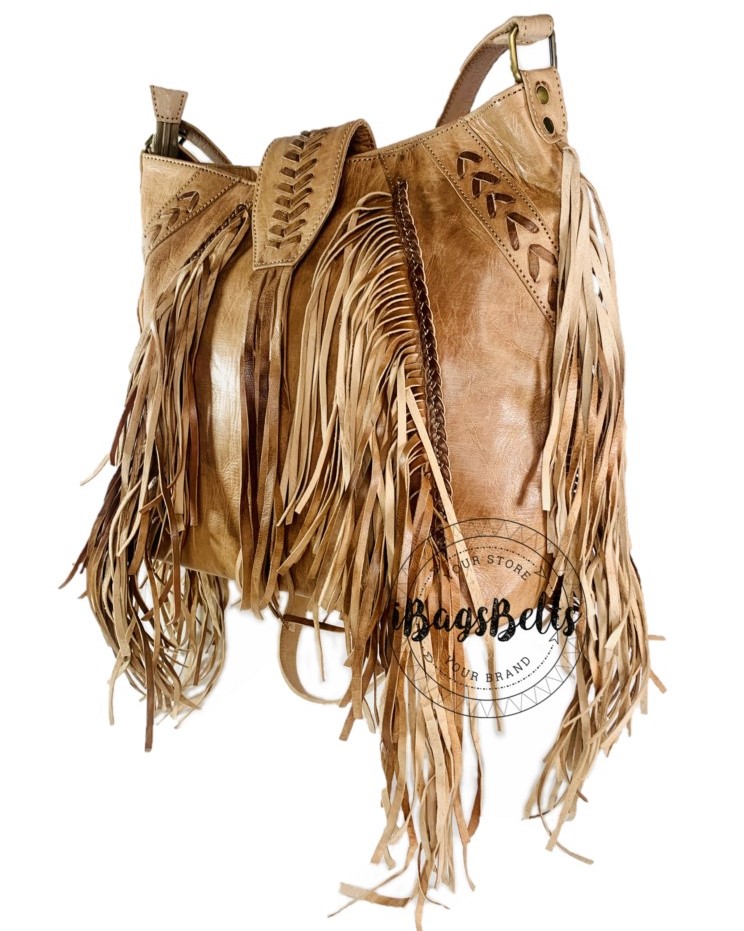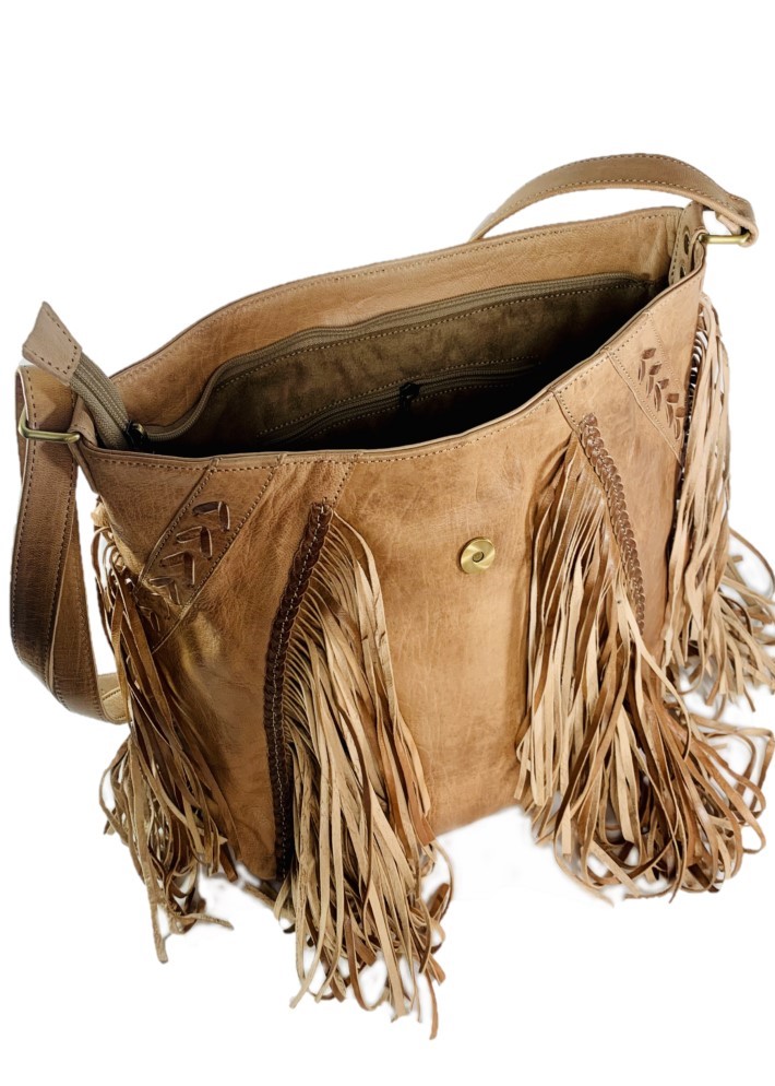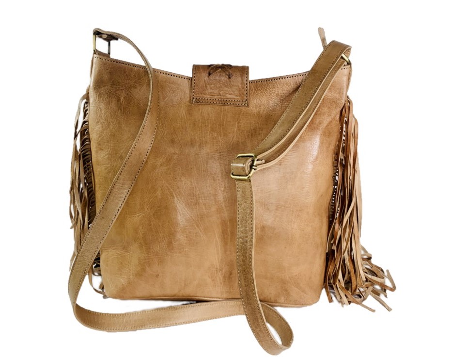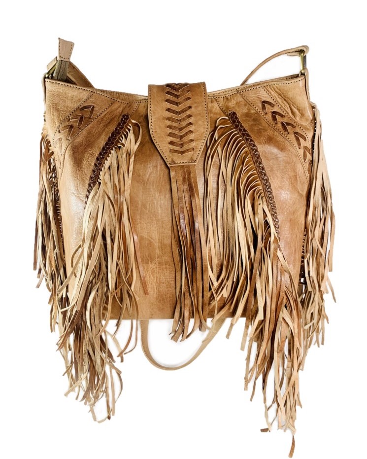 La bandolera de cuero artesanal es el complemento perfecto para cualquier look boho. Confeccionado con cuero de alta calidad y adornado con elegantes flecos en el borde, este bolso destaca por su estilo único y artesanal. Su correa de hombro ajustable te permite llevarlo cómodamente a tu medida.