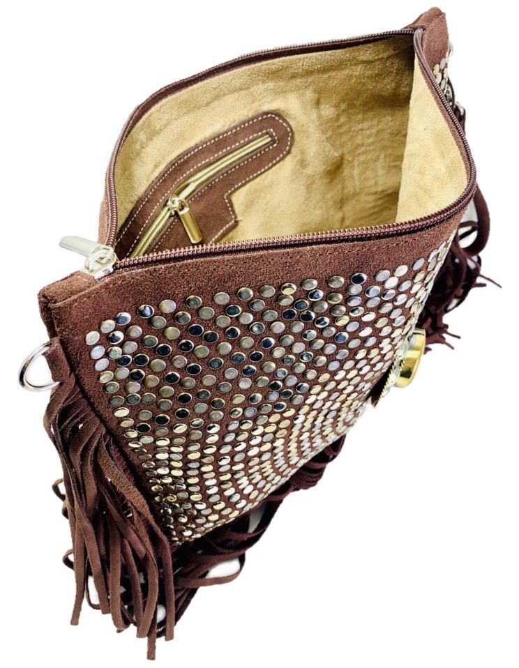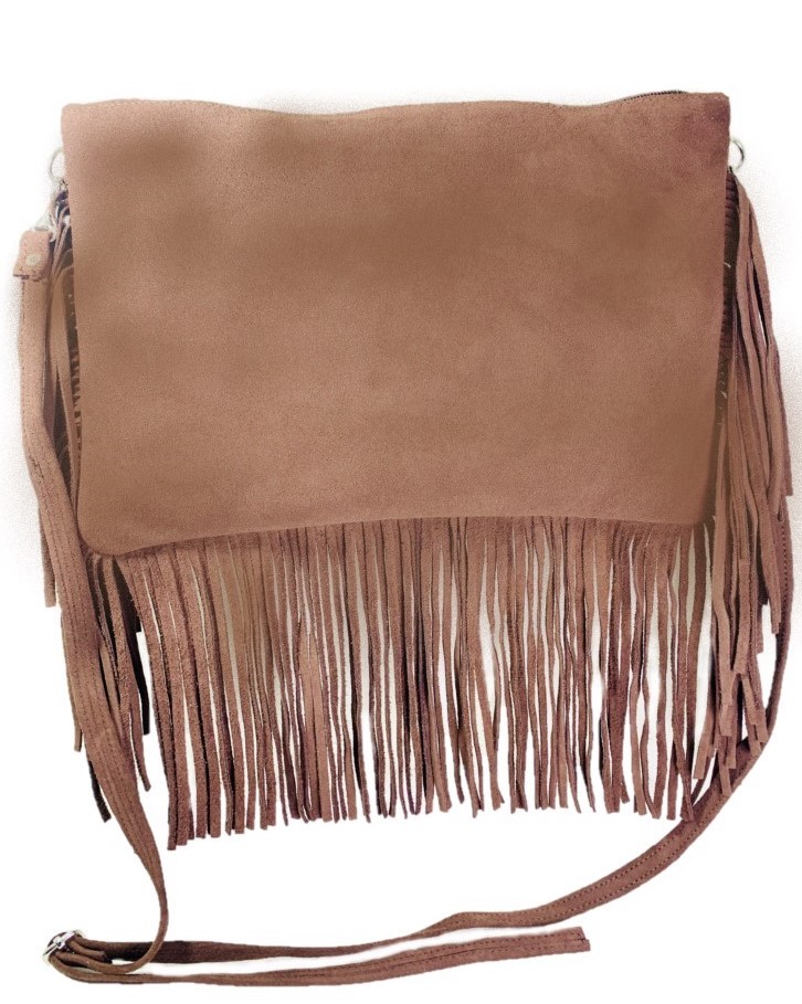 Con dos asas, una de mano y otra de hombro, este bolso es cómodo de llevar en cualquier situación. Sus medidas son 32 cm de largo y 23 cm de ancho, con una caída del fleco de 16 cm.