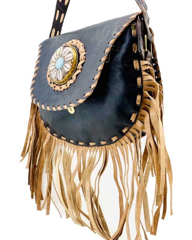 Bandolera grande en cuero artesanal con apliques metálicos en la parte frontal de la solapa, su bolsillo principal con cierre de cremallera.