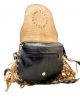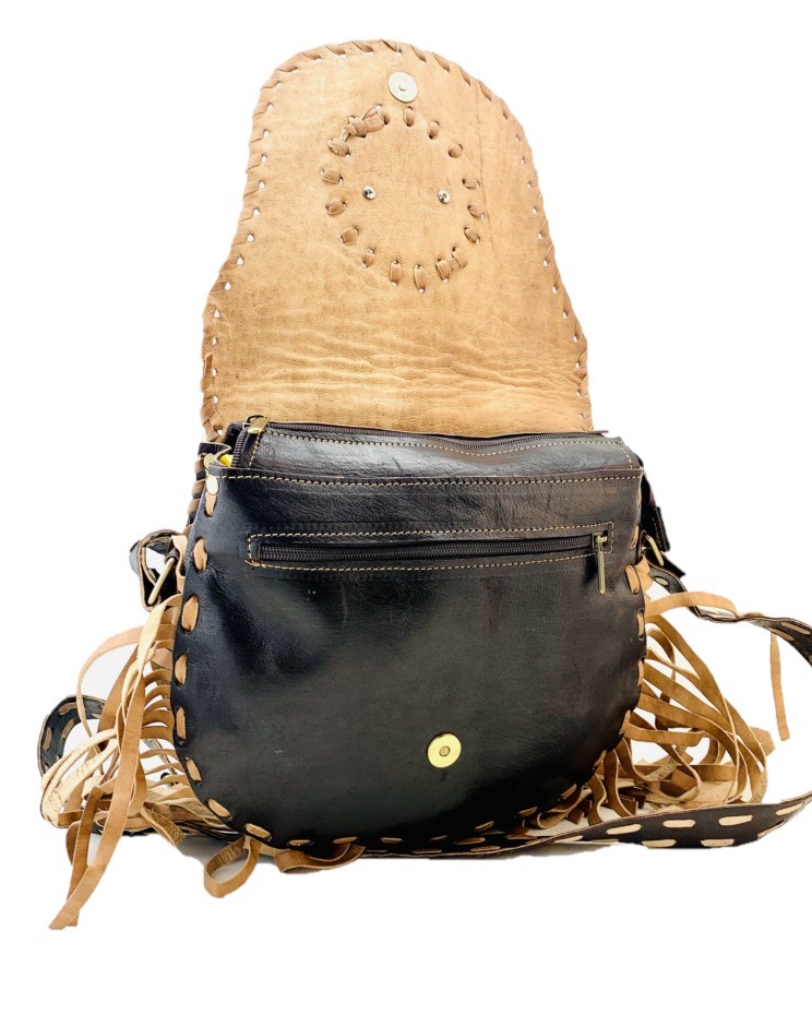 Bandolera grande en cuero artesanal con apliques metálicos en la parte frontal de la solapa, su bolsillo principal con cierre de cremallera.
