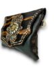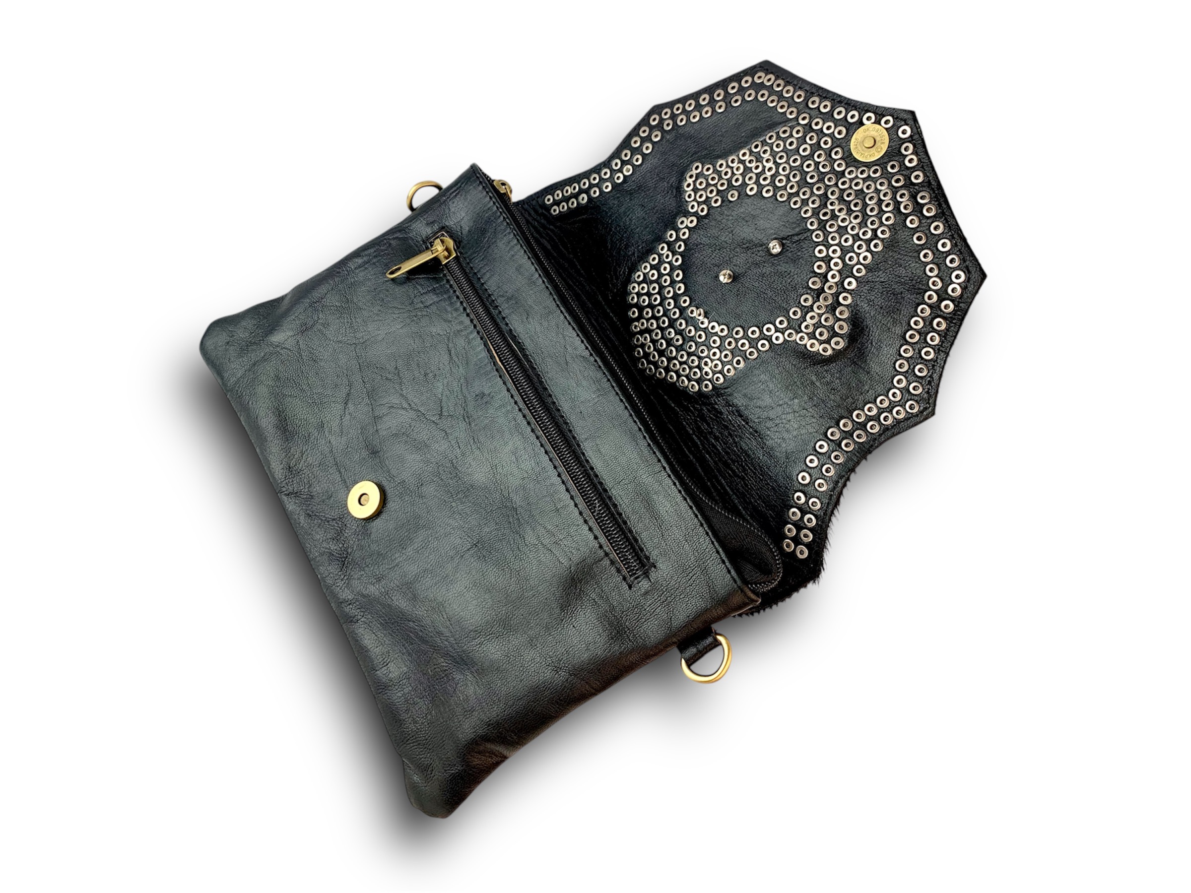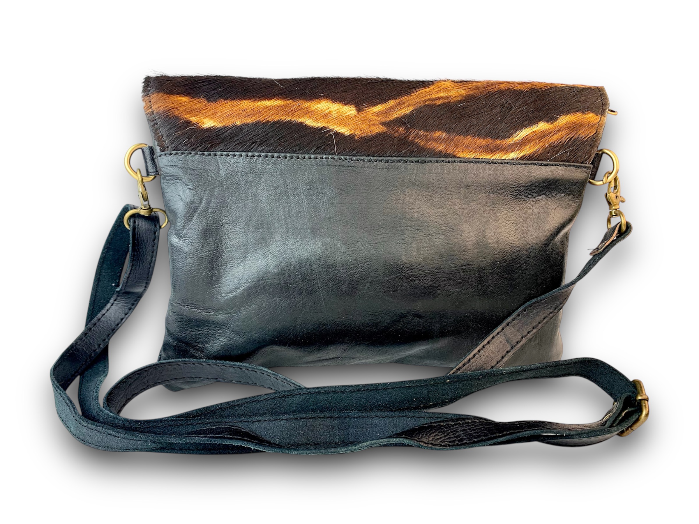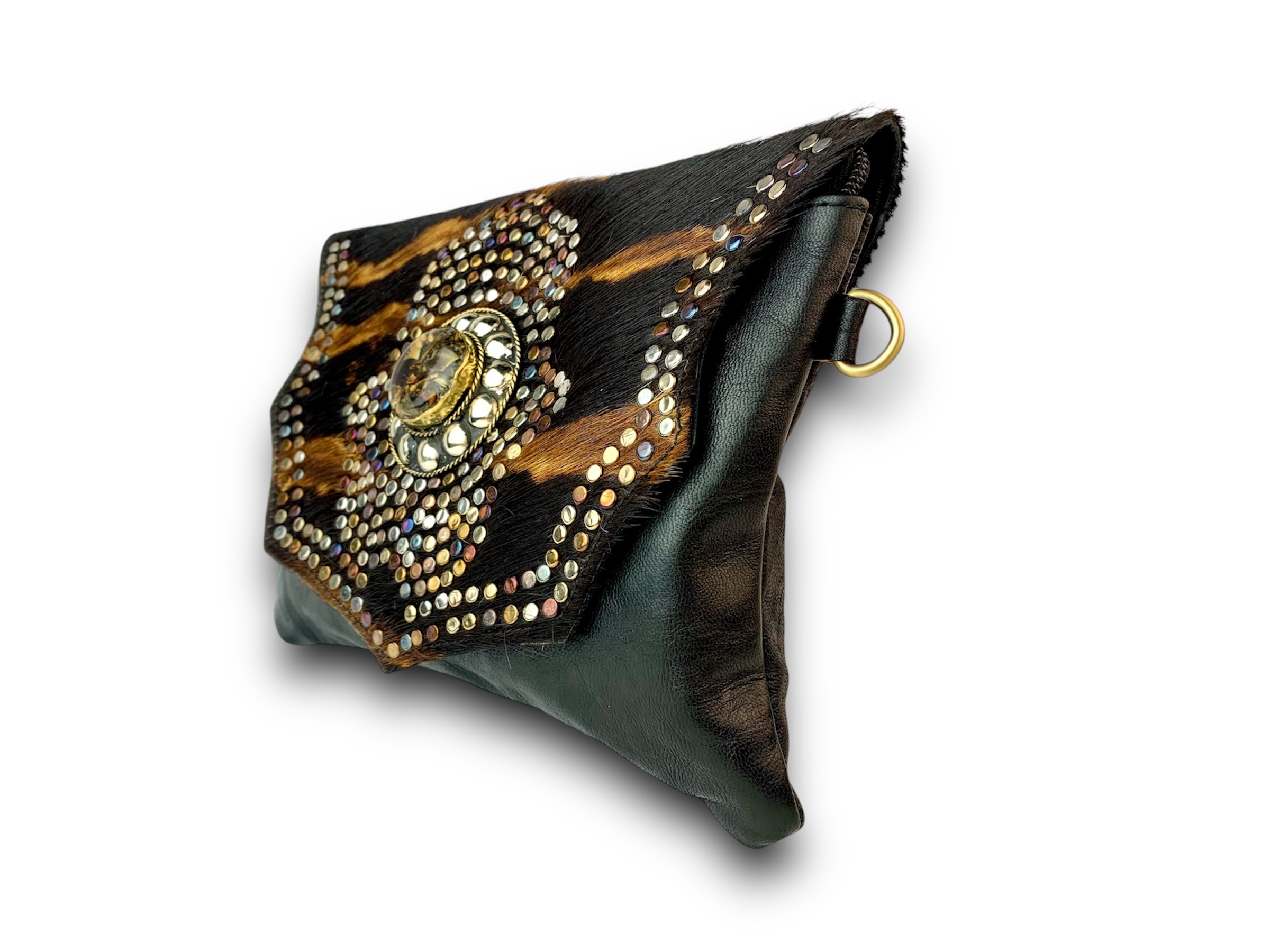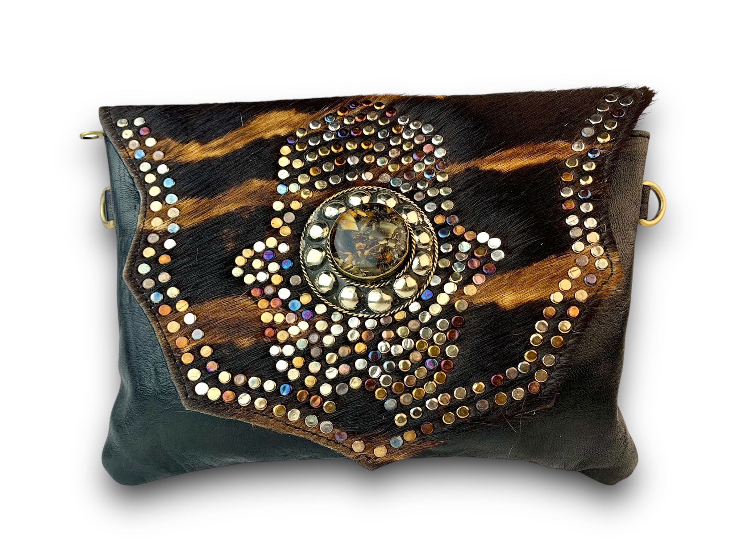 Bolso de cuero con solapa de pelo tigre animal print decorada a mano con remaches y chapón de alpaca central.