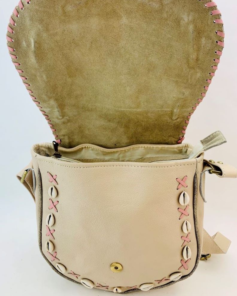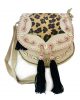 Esta elegante bandolera de cuero presenta una solapa cosida y trenzada a mano, adornada con un exquisito diseño artesanal de estampado animal en el centro, rodeado de detalles de chanchas.