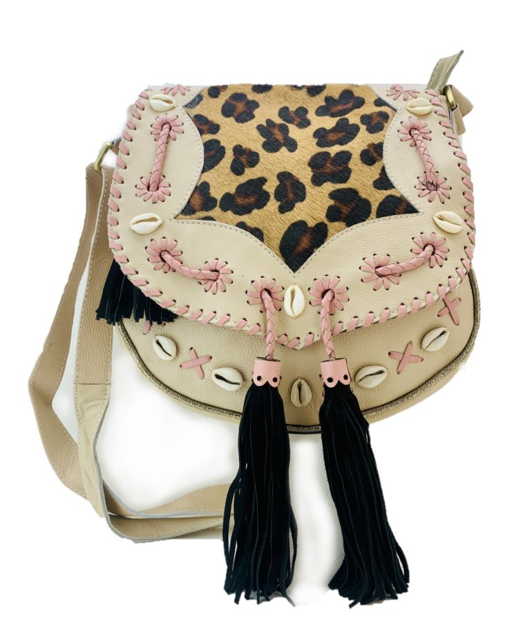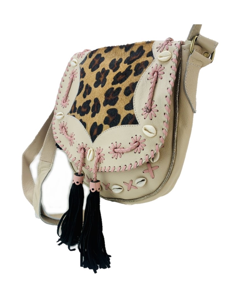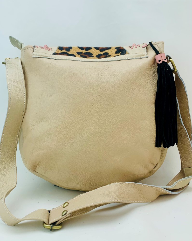 Destacando en la parte frontal con piel de pelo de leopardo, este bolso combina estilo y sofisticación a la perfección. Viene equipado con una correa ajustable para el hombro, ofreciendo comodidad y versatilidad en su uso.