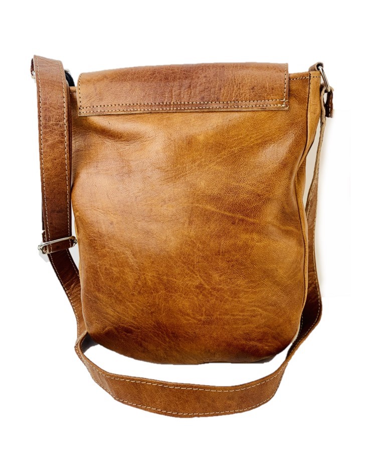 Este elegante bolso bandolera presenta un diseño único con detalles artesanales que lo hacen destacar. Fabricado en cuero de alta calidad, la solapa está decorada con un hermoso medallón artesanal rodeado de tachas en color plata vieja, añadiendo un toque distintivo al conjunto.