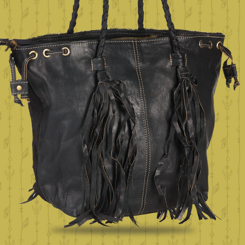 Explora el encanto del invierno con nuestro exclusivo bolso de cuero en elegante negro, acentuado con piel de potro en un cautivador animal print. Sus asas trenzadas, adornadas con borlas, aportan un toque boho chic que transformará tu estilo.
