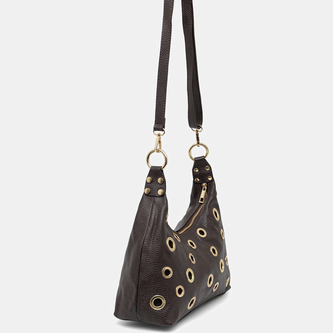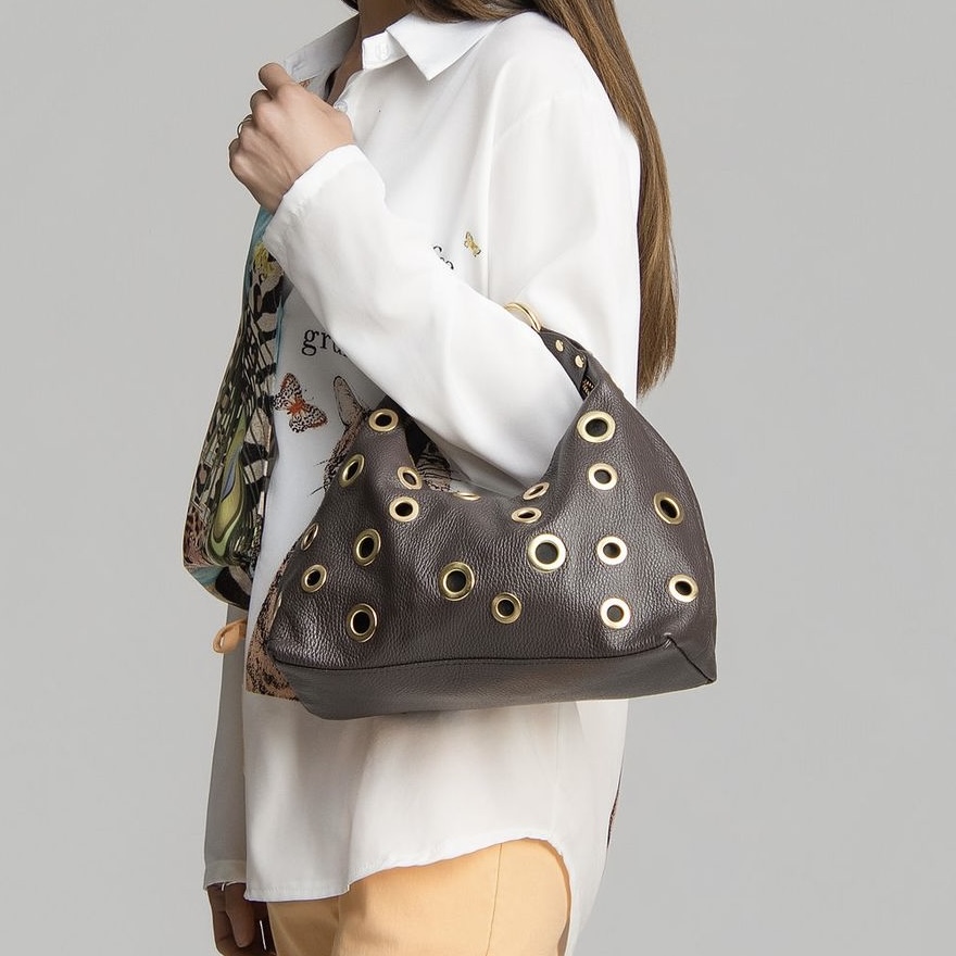 Bolso de cuero con ojales, de estilo moderno y carácter sofisticado, fabricado en piel auténtica en Italia. Su diseño funcional y elegante lo convierte en un complemento ideal para el día a día, combinando practicidad y estilo.