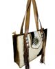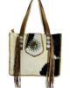 Bolso de cuero con flecos. Con cierre de cremallera y con pelo de vaca animal print y un medallón artesanal de alpaca color plata para darle el toque artesanal en esta pieza, en su interior bolsillo con cremallera forrado con tela de algodón, asas largas para llevarlo en el hombro.