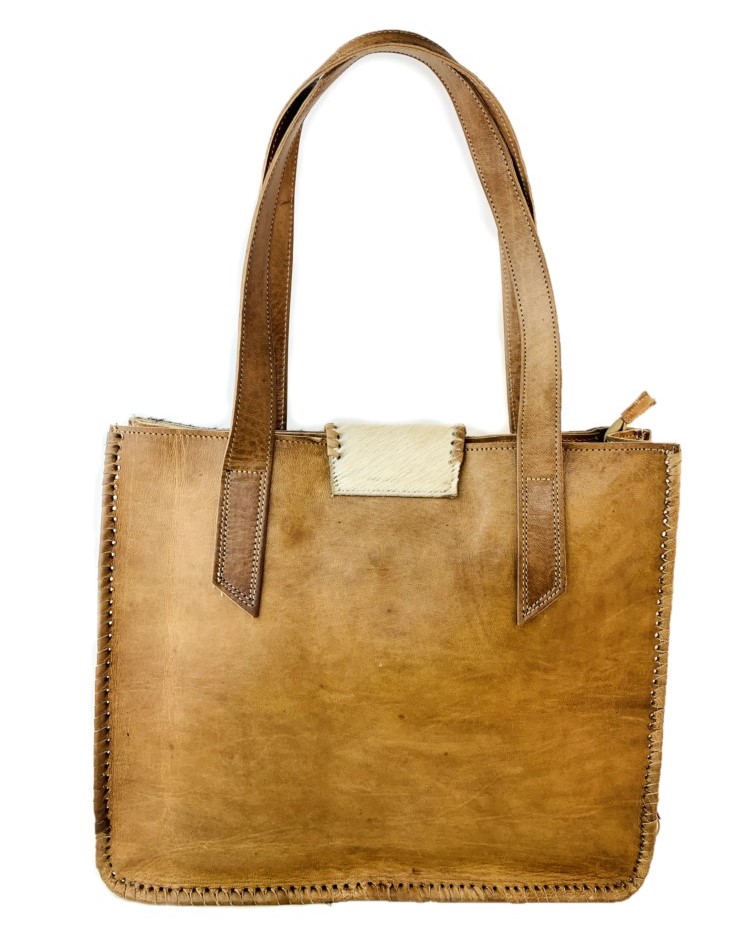 Bolso de cuero grande hecha a mano muy bonito ya por su color su diseño y un toque salvaje al unir dos tipos de cuero. Dispone de cierre con cremallera.