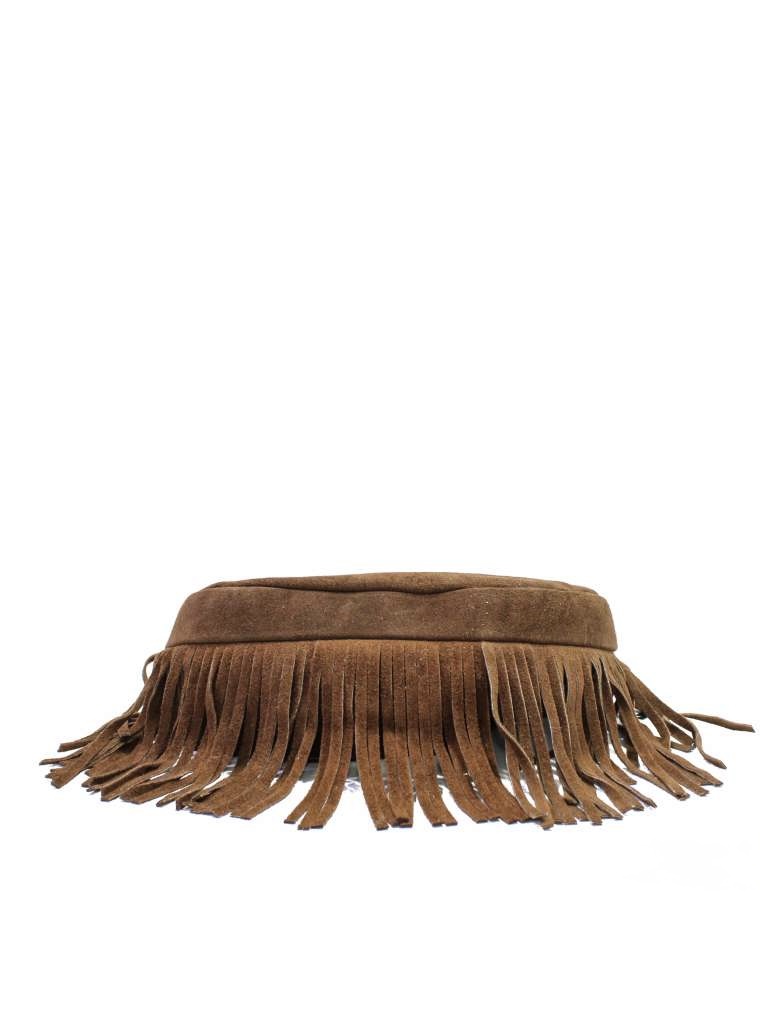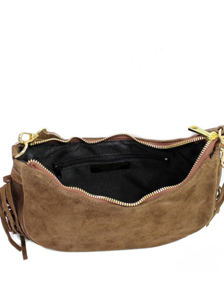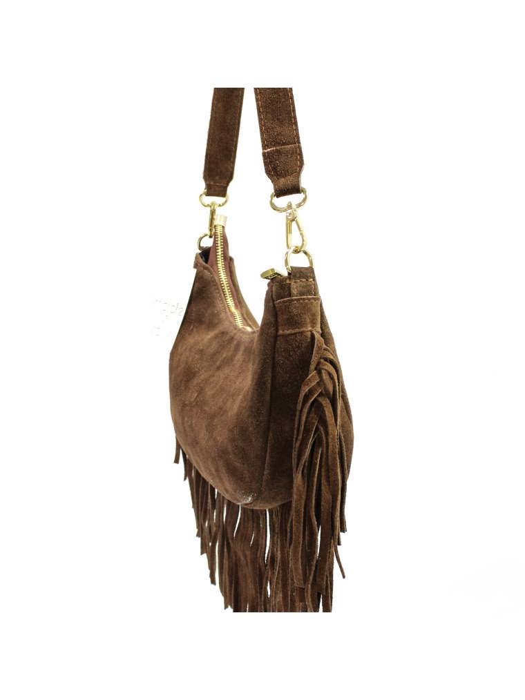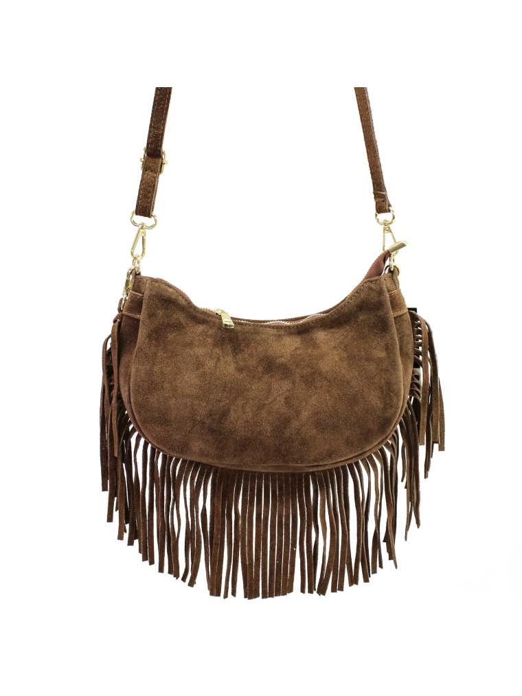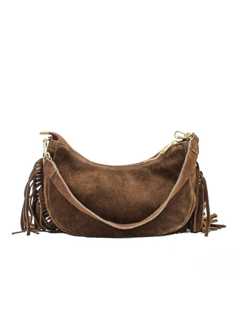 Fabricado en piel serraje de alta calidad, su tacto suave y diseño con forma media luna lo convierten en un accesorio cómodo, versátil y lleno de personalidad. Los flecos laterales y frontales aportan movimiento y un toque desenfadado ideal para looks casuales o más sofisticados.
