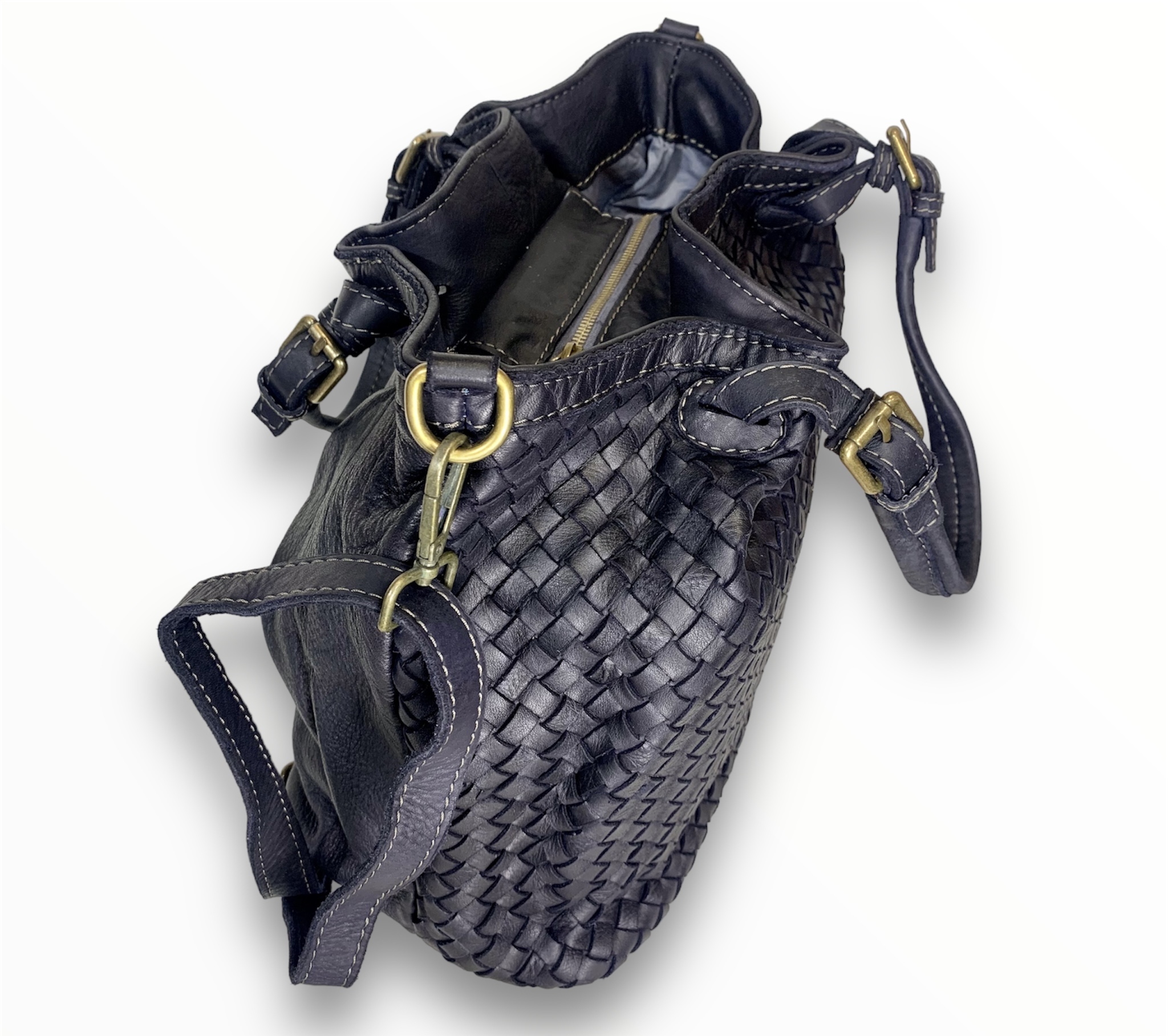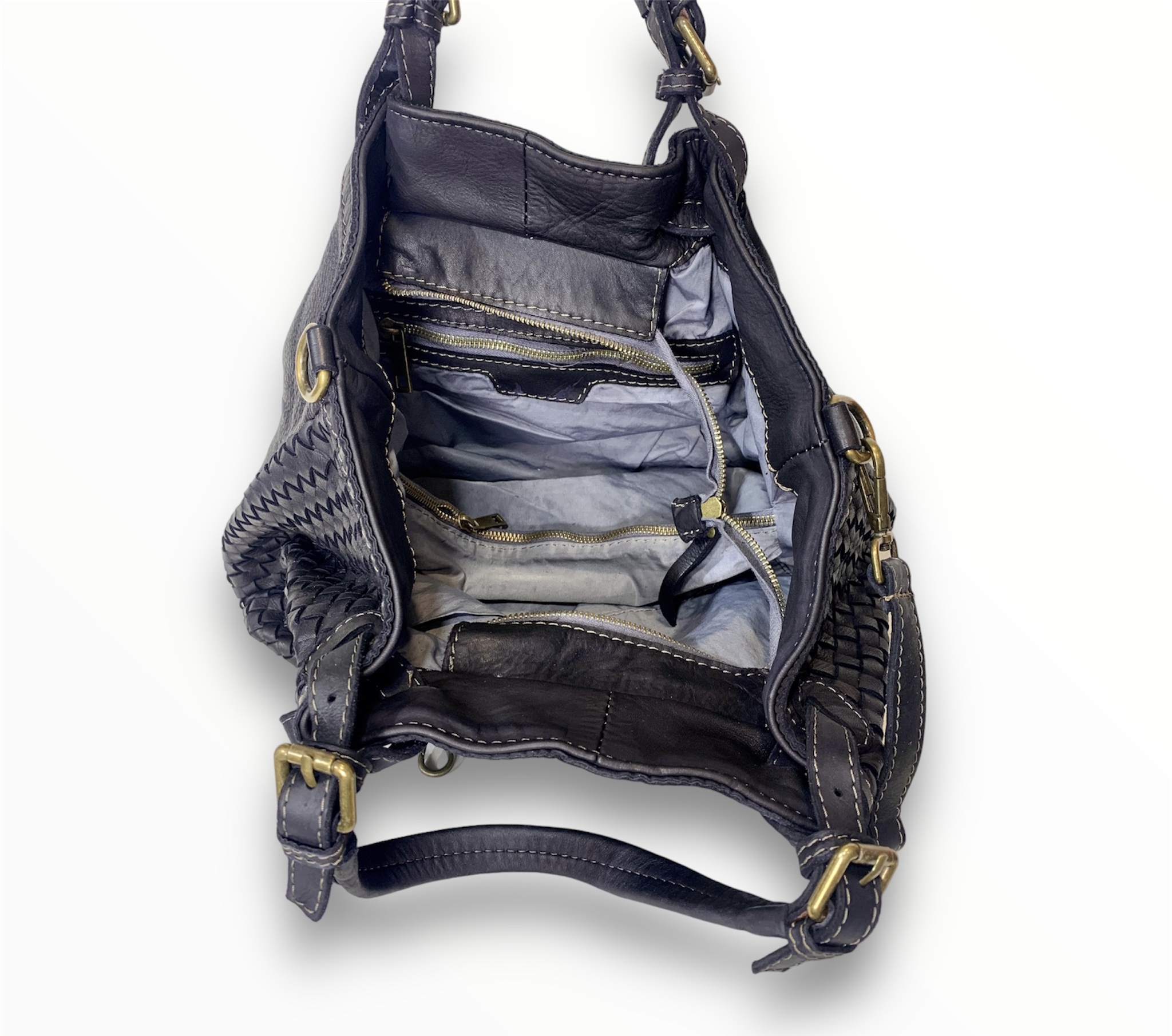 Bolso bandolera de hermoso diseño ideal para el día a día. Piel vintage tejida a mano con un diseño suave y holgado, correas con cinturón y dos secciones interiores divididas por un gran bolsillo con cremallera.