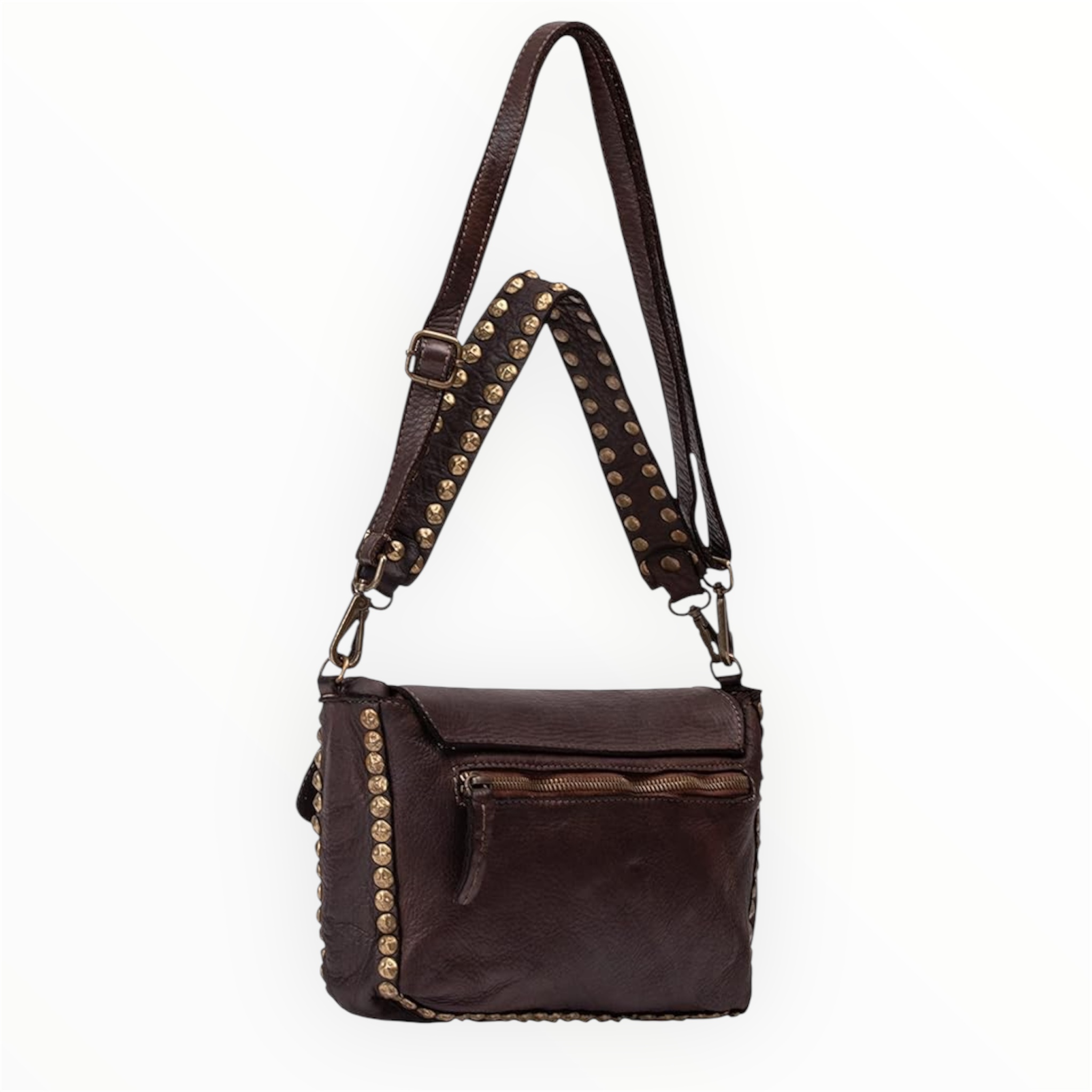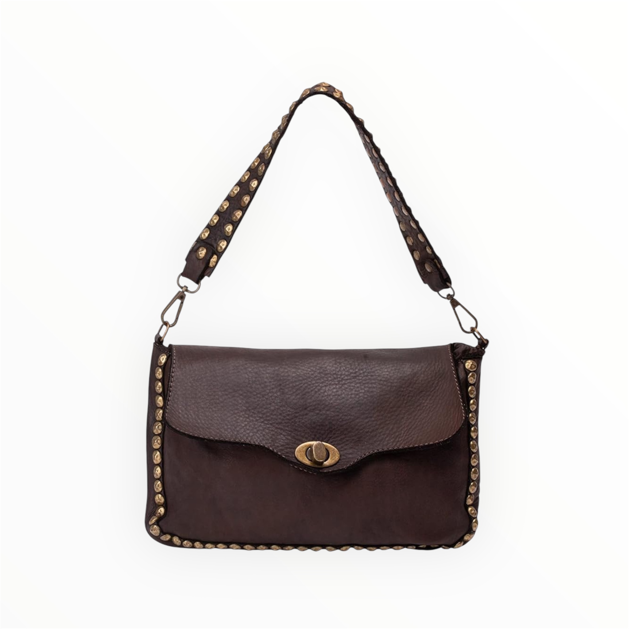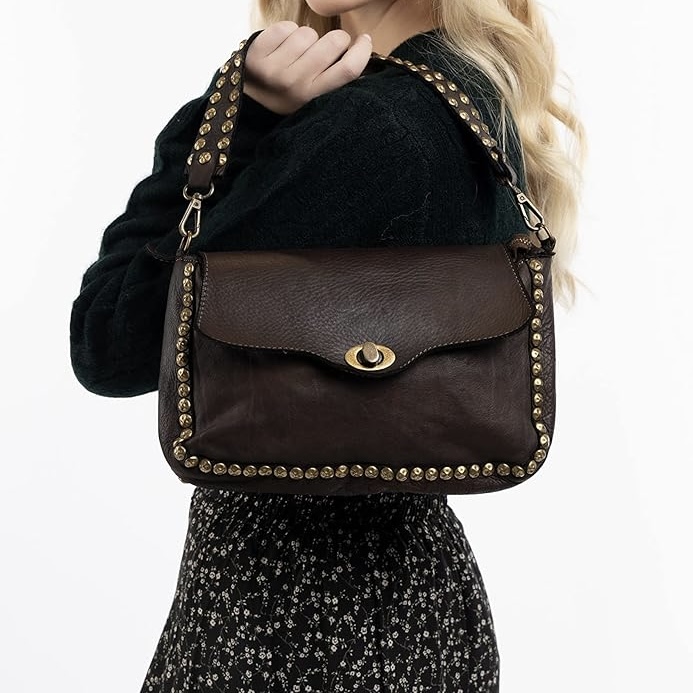 Descubre este elegante bolso de hombro confeccionado en piel de vacuno de estilo vintage, adornado con tachuelas que le confieren un toque único. Este bolso es una pieza llamativa y versátil para complementar tu estilo.
