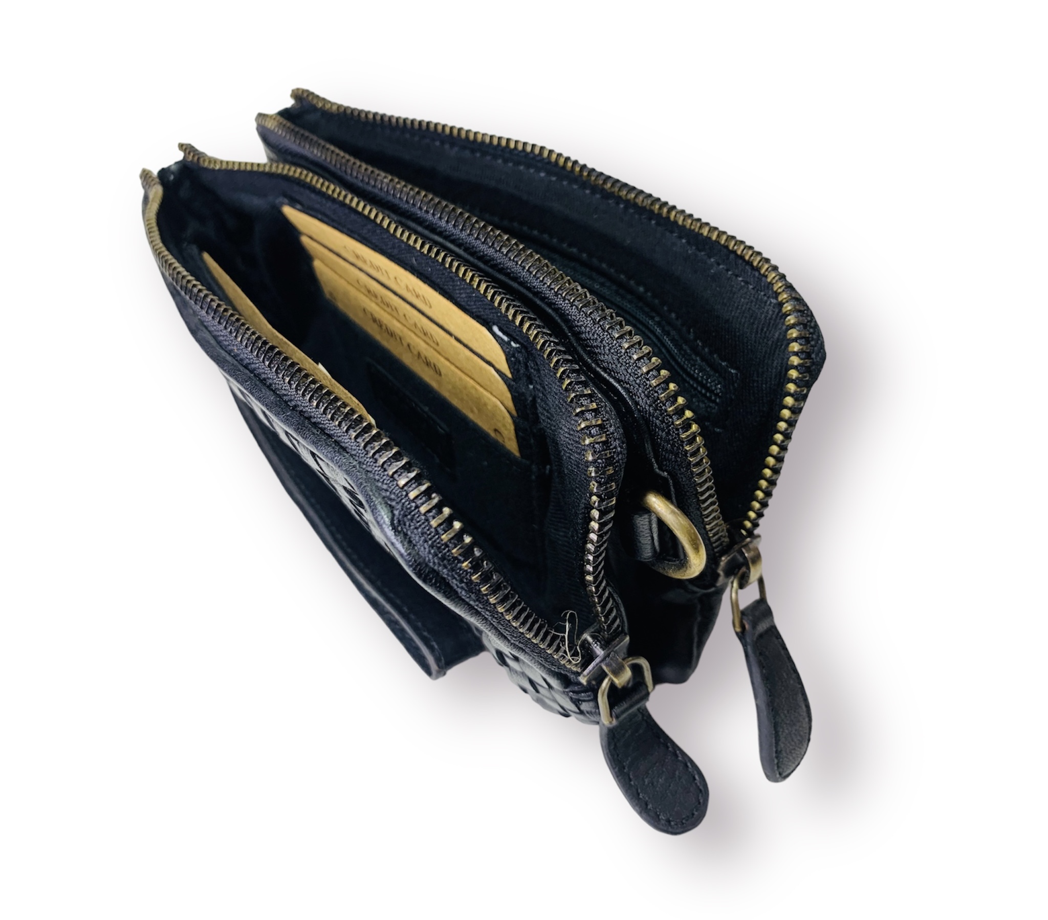 Fabricada a mano en suave cuero italiano vintage trenzado envejecido, nuestra nueva cartera, billetera, tarjetero es lo suficientemente espaciosa para su teléfono celular y tiene dos correa de cuero una de mano y otra para llevarla como bandolera. Sirve como bolso de mano para una salida nocturna.