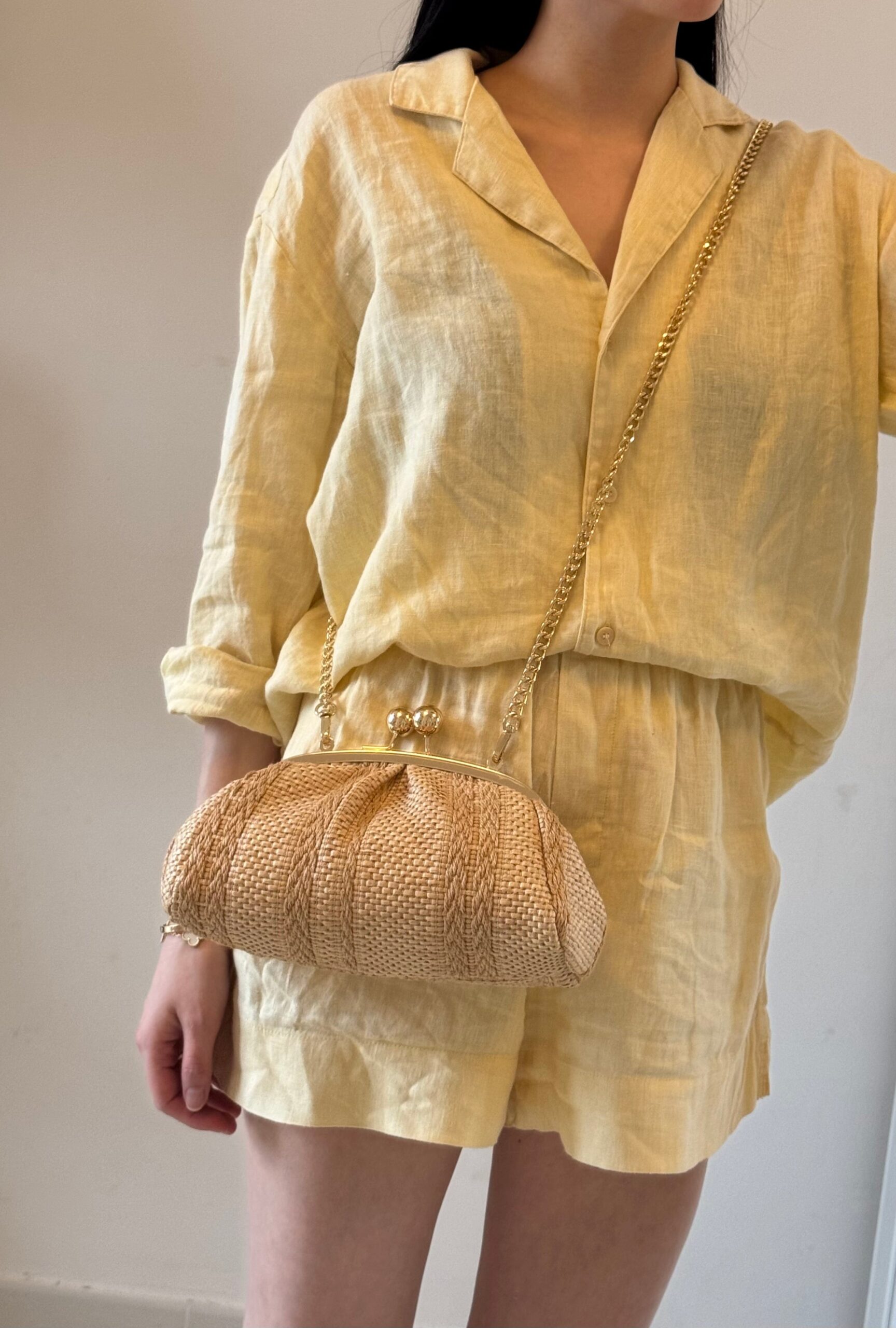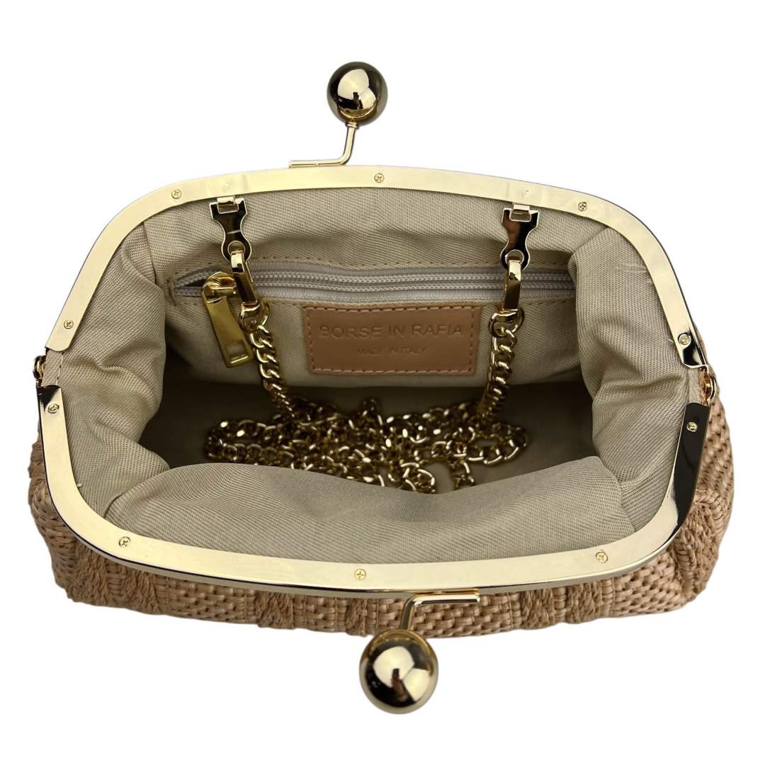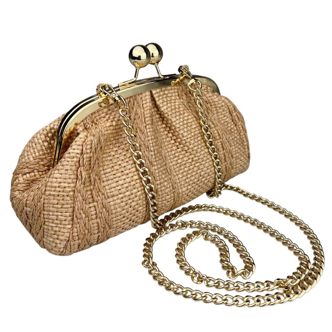 Compacto pero con buena capacidad, es perfecto para acompañarte tanto de día como en noches de verano. Se puede llevar en la mano con su asa cómoda o cruzado gracias a la correa de cadena dorada incluida.