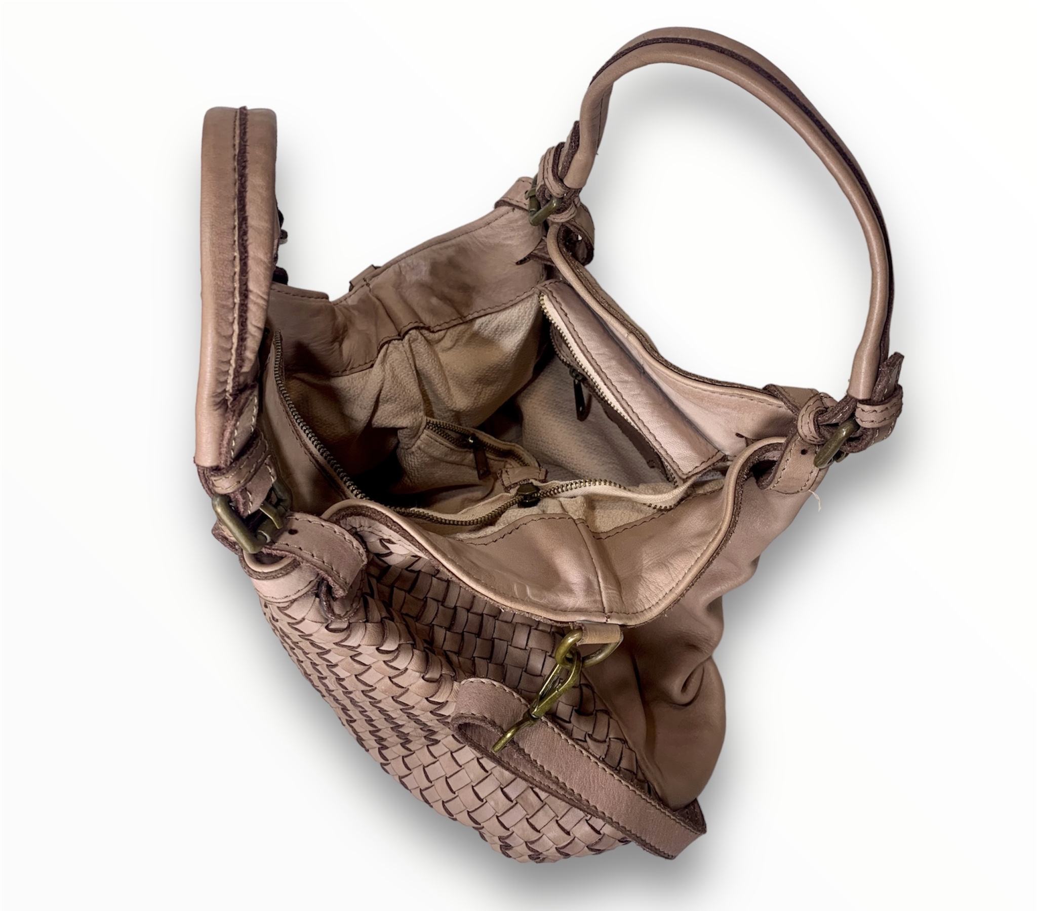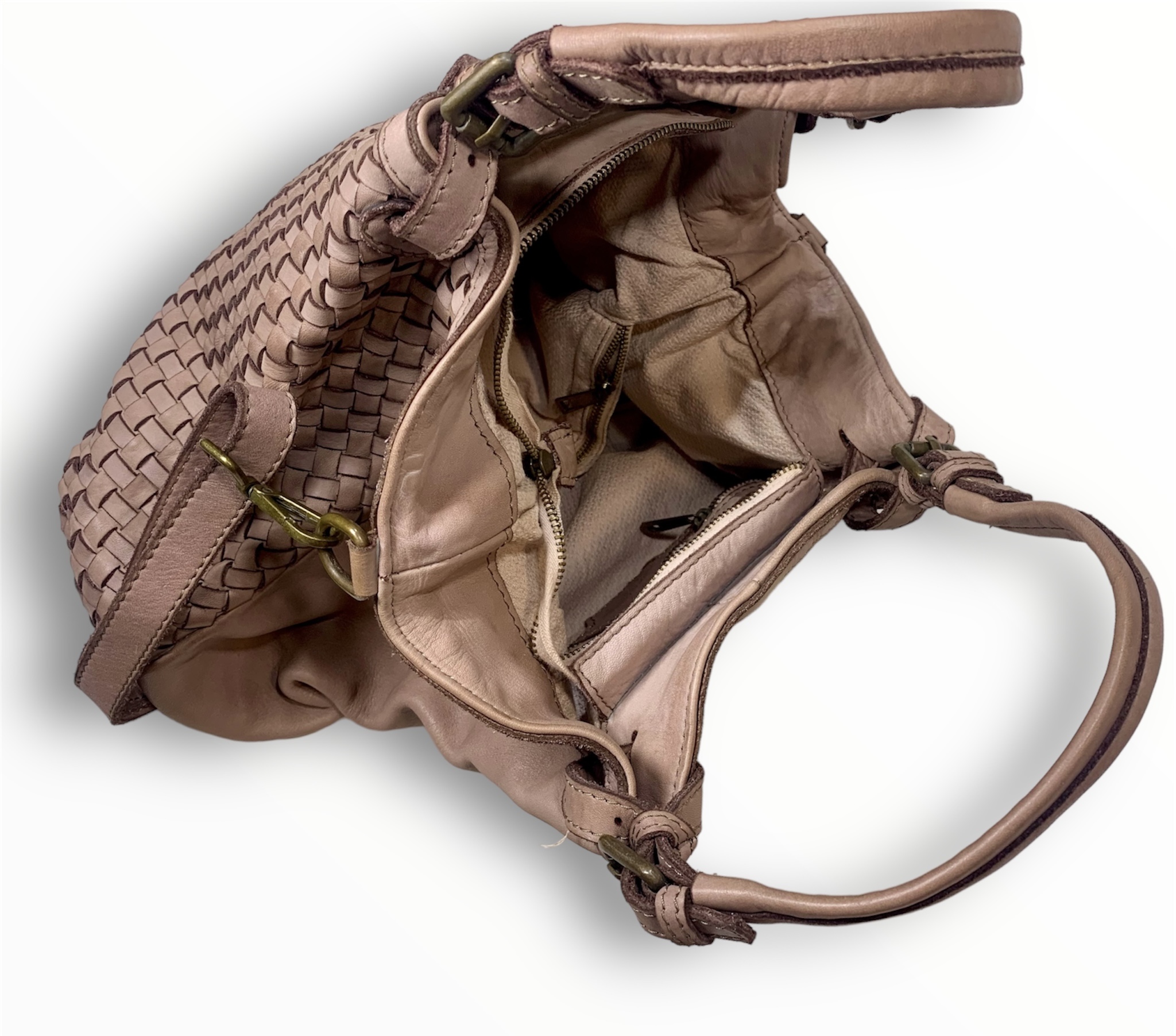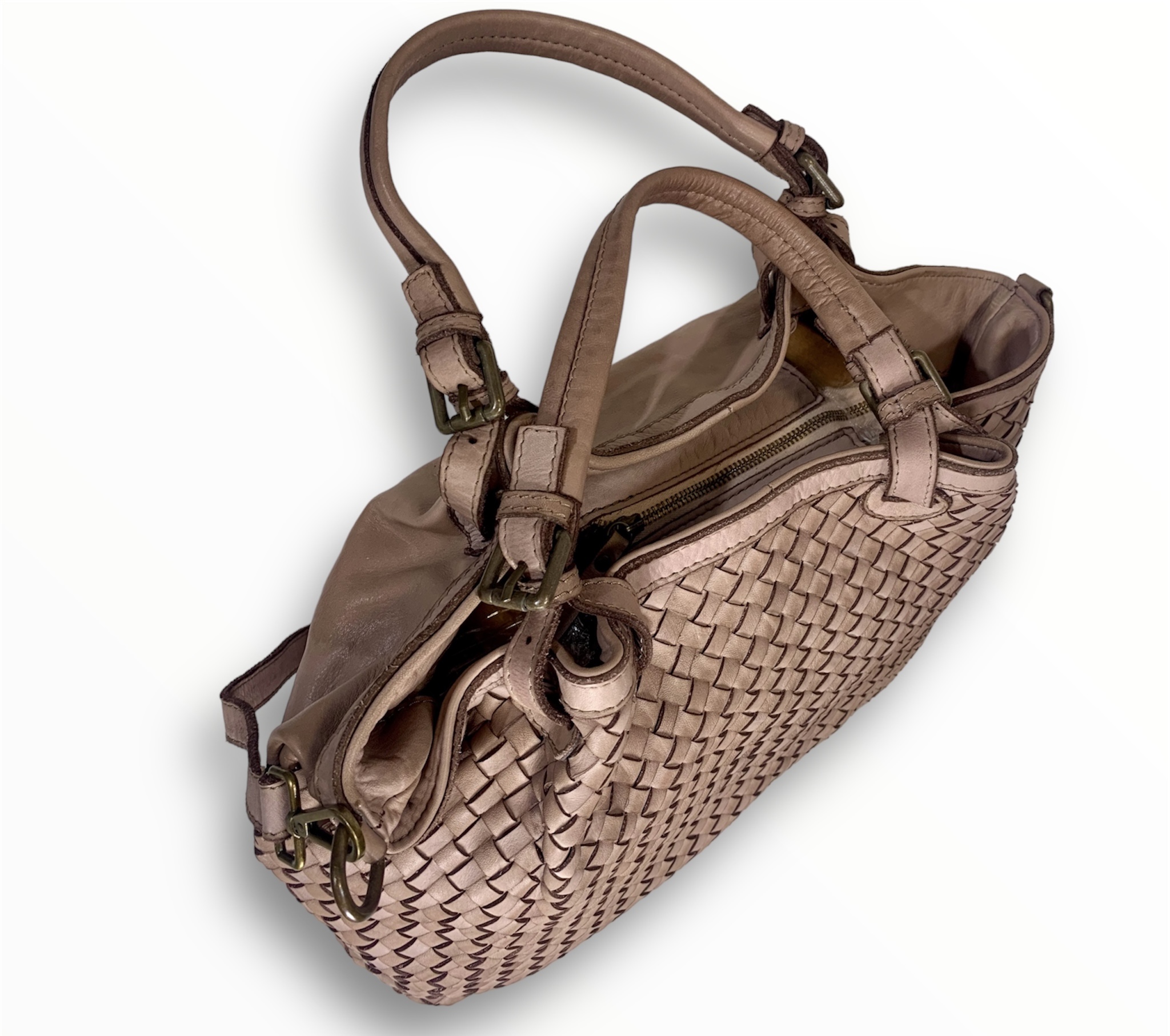 Bolso bandolera de hermoso diseño ideal para el día a día. Piel vintage tejida a mano con un diseño suave y holgado, asas dobles ajustable con hebillas, correas con cinturón para bandolera y dos secciones interiores divididas por un gran bolsillo con cremallera.