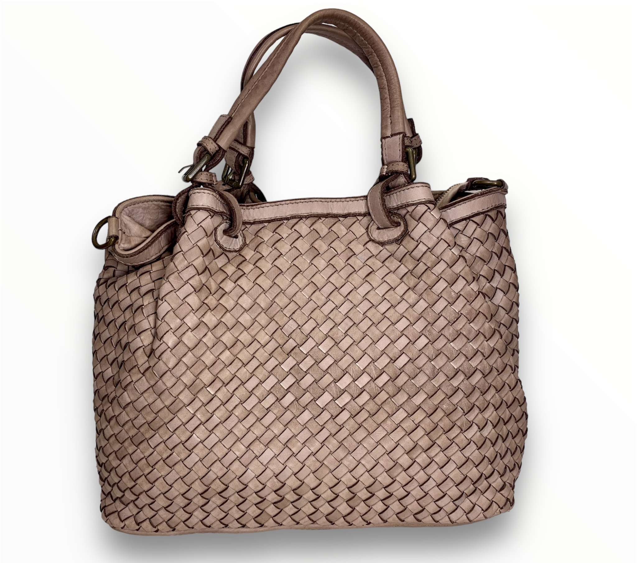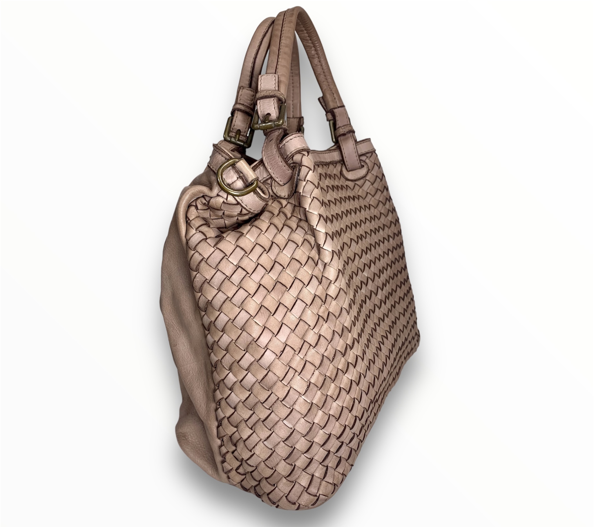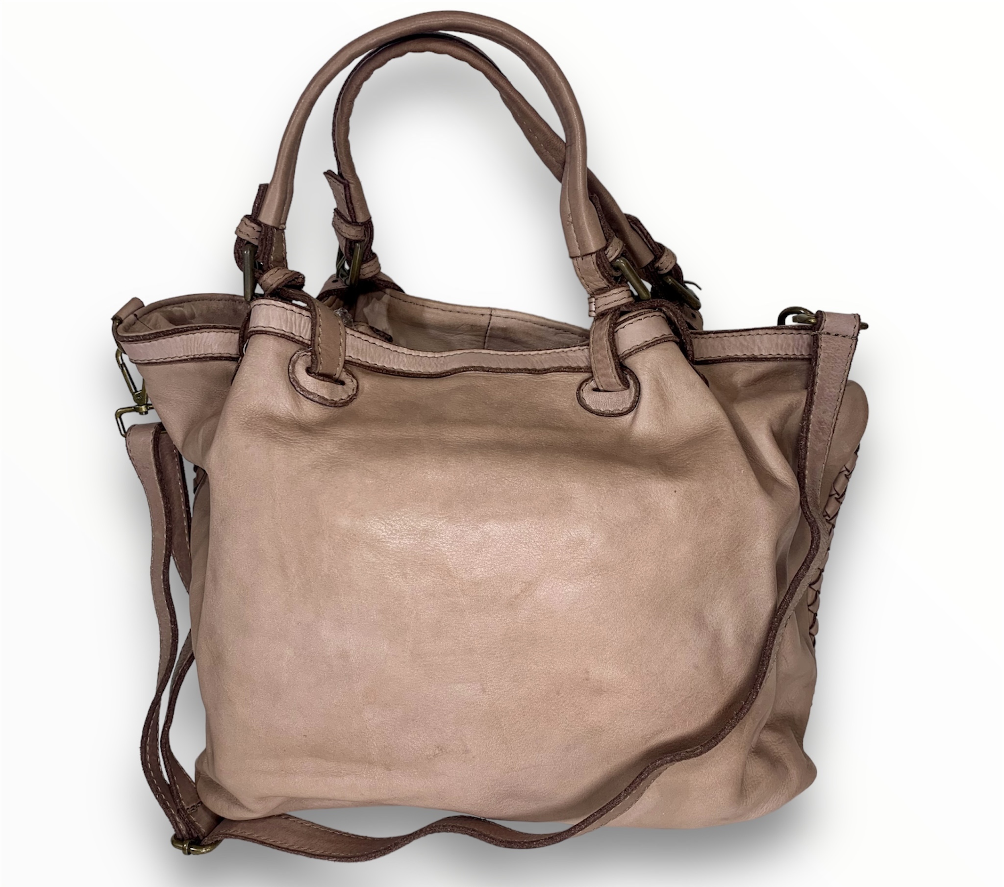 Bolso bandolera de hermoso diseño ideal para el día a día. Piel vintage tejida a mano con un diseño suave y holgado, asas dobles ajustable con hebillas, correas con cinturón para bandolera y dos secciones interiores divididas por un gran bolsillo con cremallera.
