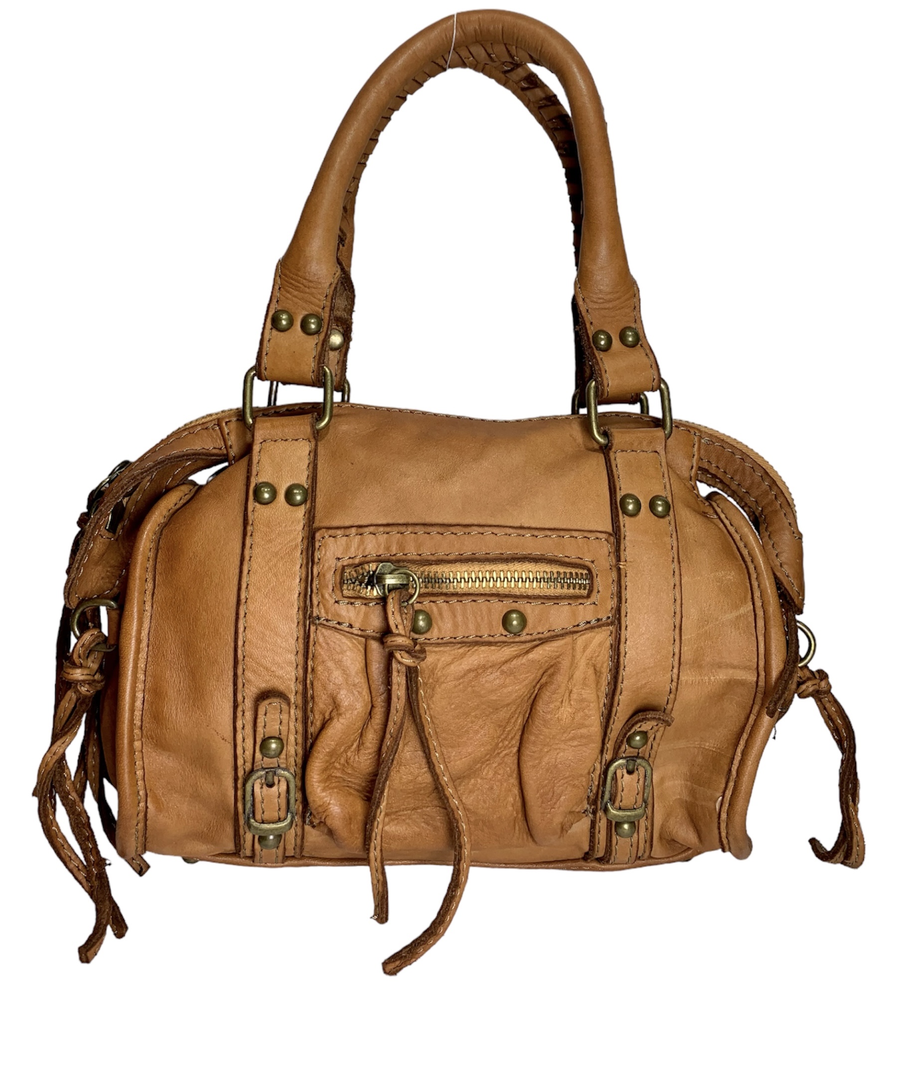 Correa de piel suave ajustable. En el exterior: bolsillo frontal con cremallera y Detalles de borlas extraíbles.