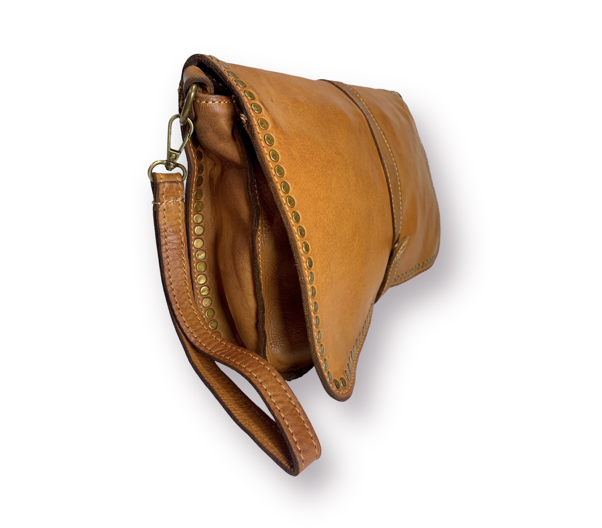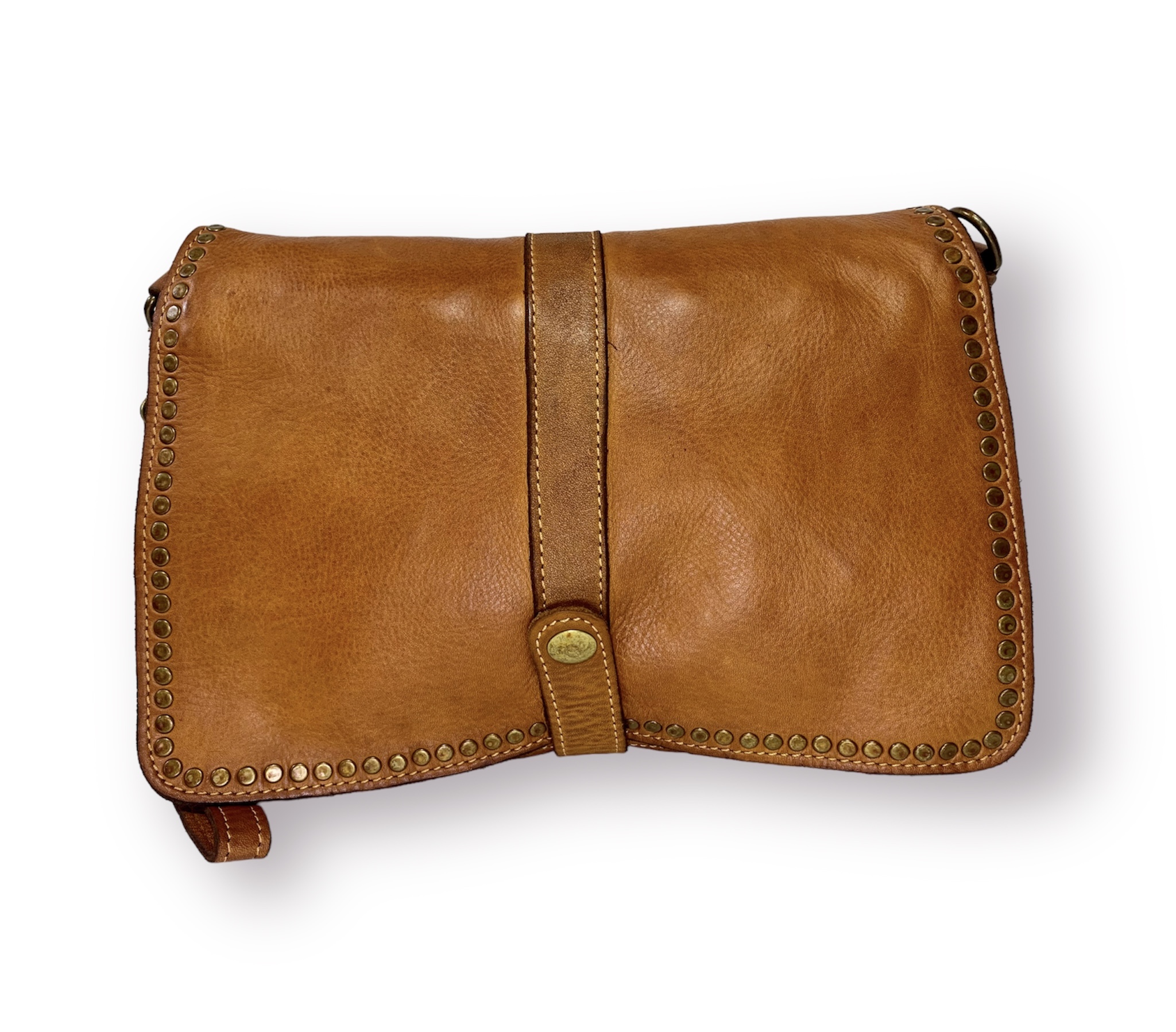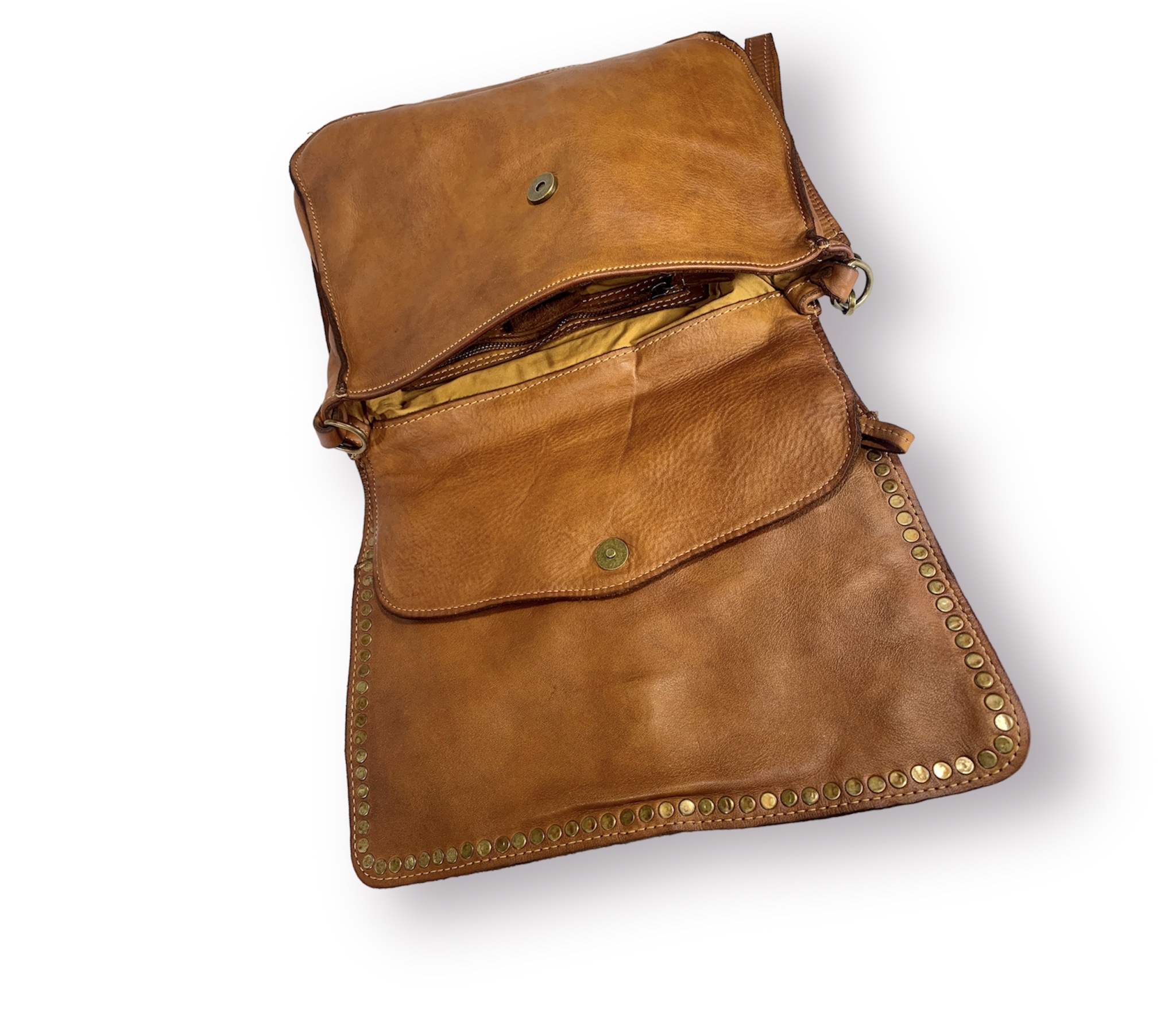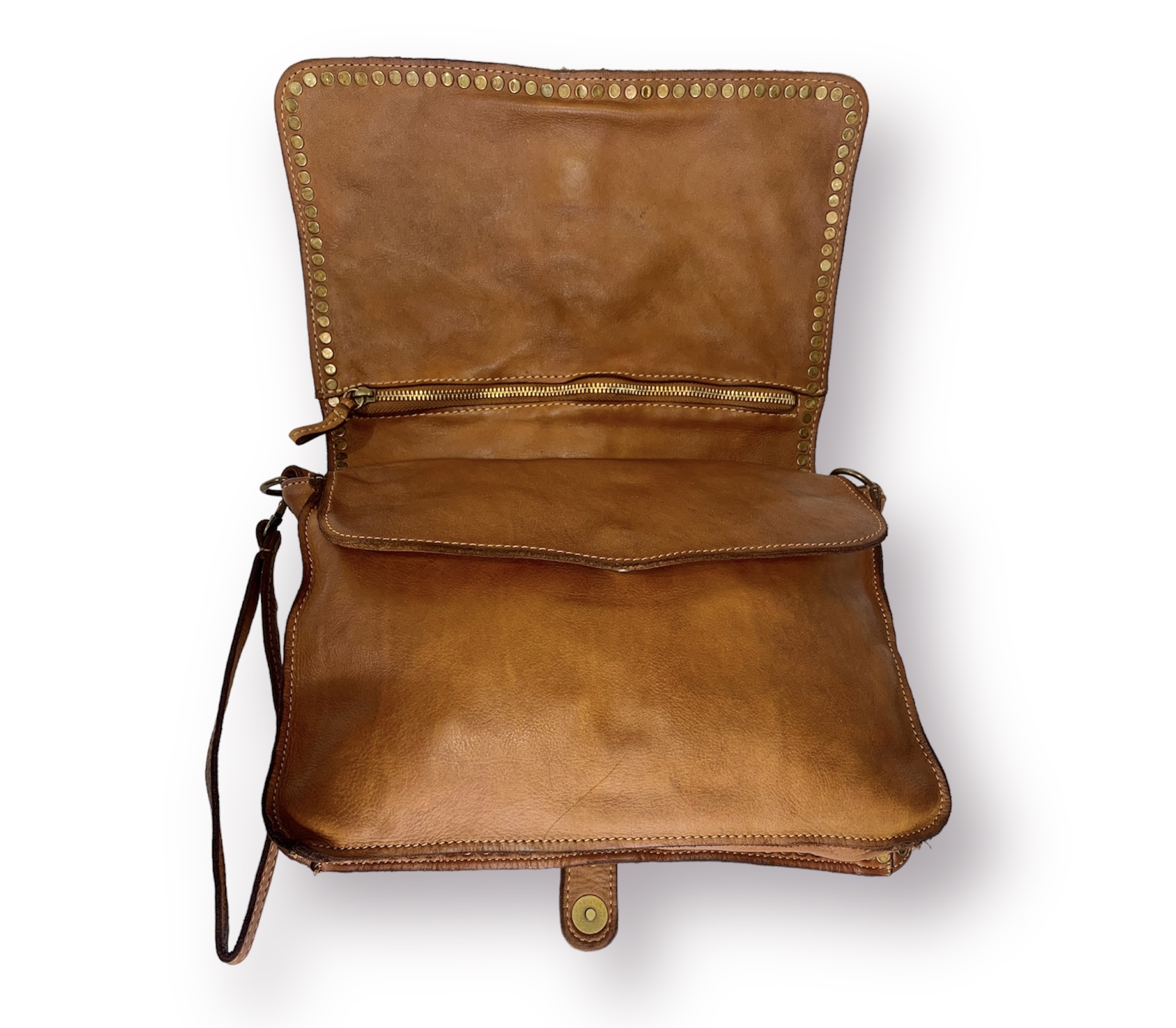 Descubre la versatilidad y el estilo único de nuestro bolso de piel italiana, diseñado para adaptarse a cualquier ocasión y género. Este impresionante bolso bandolera y clutch unisex combina la elegancia de la piel envejecida con detalles de tachuelas de latón envejecido, creando un accesorio sofisticado y funcional que es perfecto tanto para el día como para la noche.