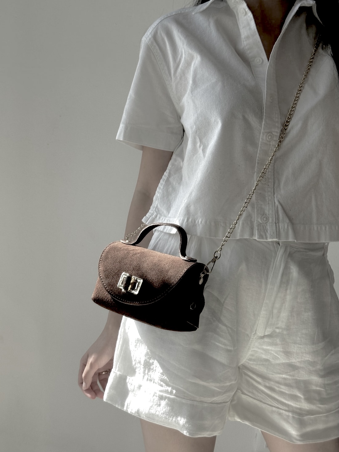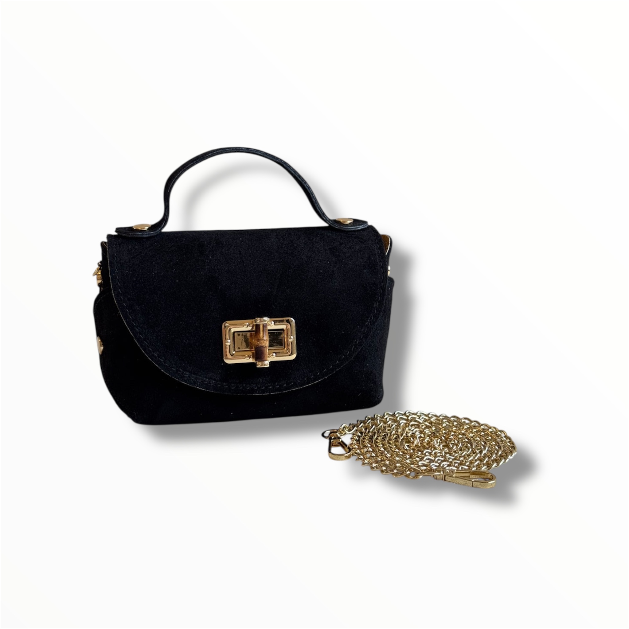 Este bolso de mano Viviana destaca por su diseño sofisticado y versátil. Fabricado en piel ante de alta calidad y cierre de Bambú en un elegante tono elegante, combina a la perfección con cualquier look. Su cadena dorada desmontable aporta un toque de glamour y permite llevarlo cómodamente al hombro o como bolso de mano.