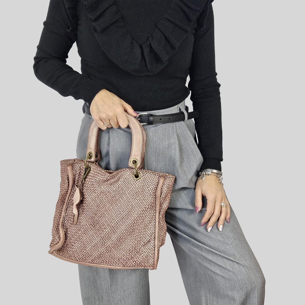 El detalle del tejido de cuero le da un toque único y llamativo a este bolso, mientras que la correa de hombro ajustable y extraíble te ofrece versatilidad y comodidad en el transporte.