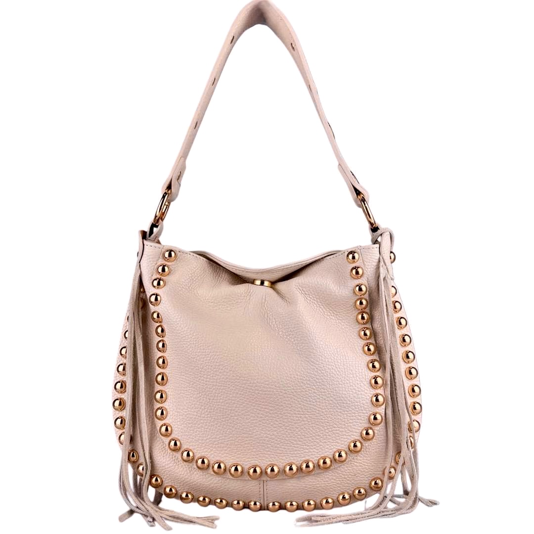 Este bolso de piel genuina martillada es la combinación perfecta entre elegancia y actitud. Su diseño destaca por las tachuelas doradas cuidadosamente distribuidas, que aportan un toque sofisticado y moderno, ideal para elevar cualquier look.